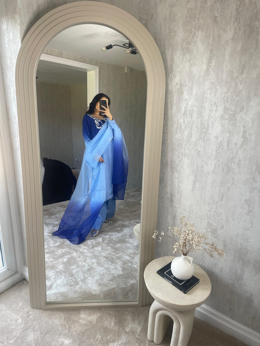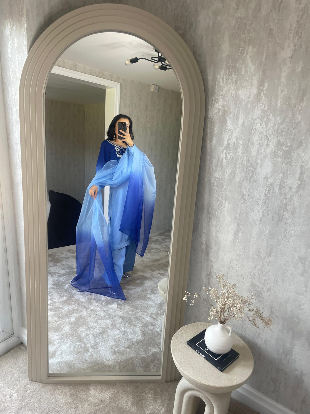 A graceful blue ombré silk outfit featuring delicate handwork embroidery on the front of the kameez, adding texture, elegance, and artisanal charm.