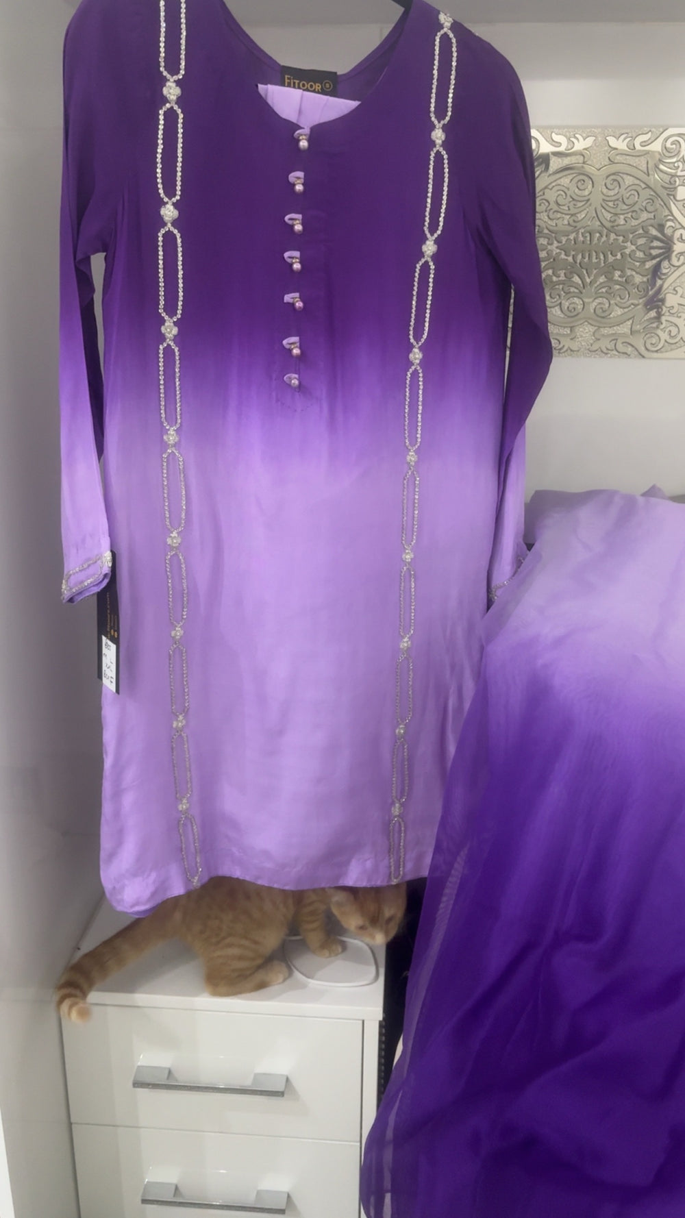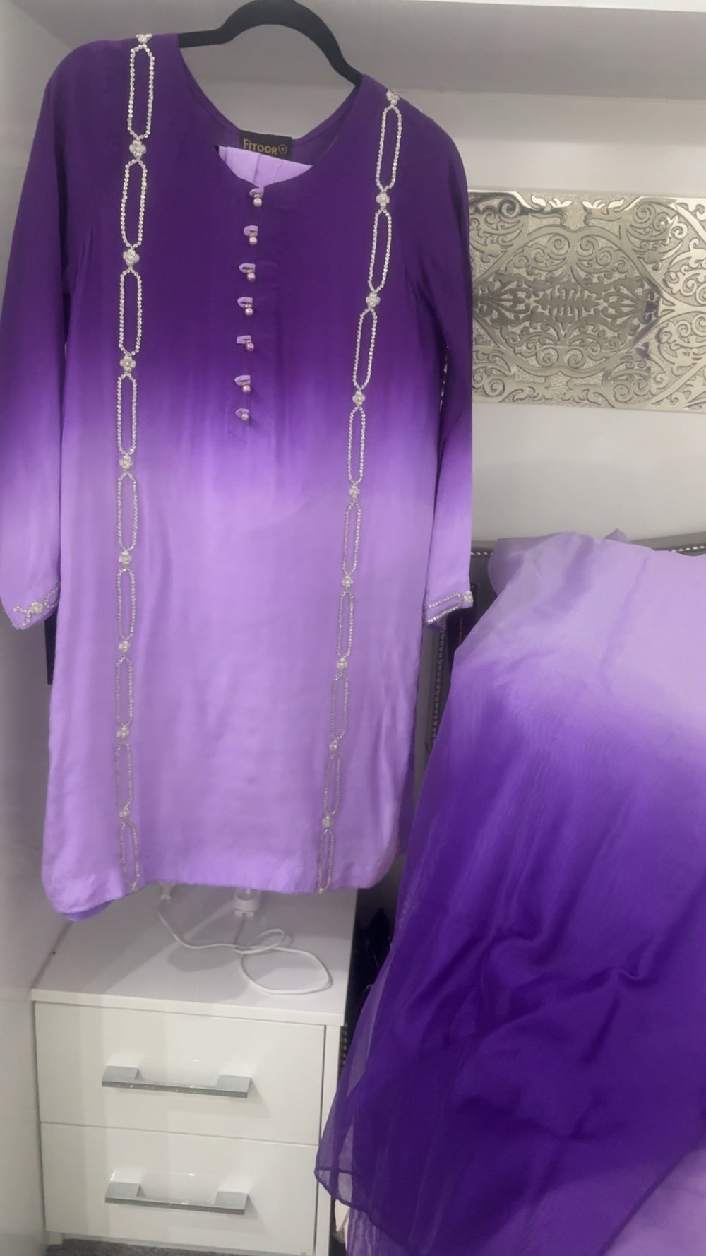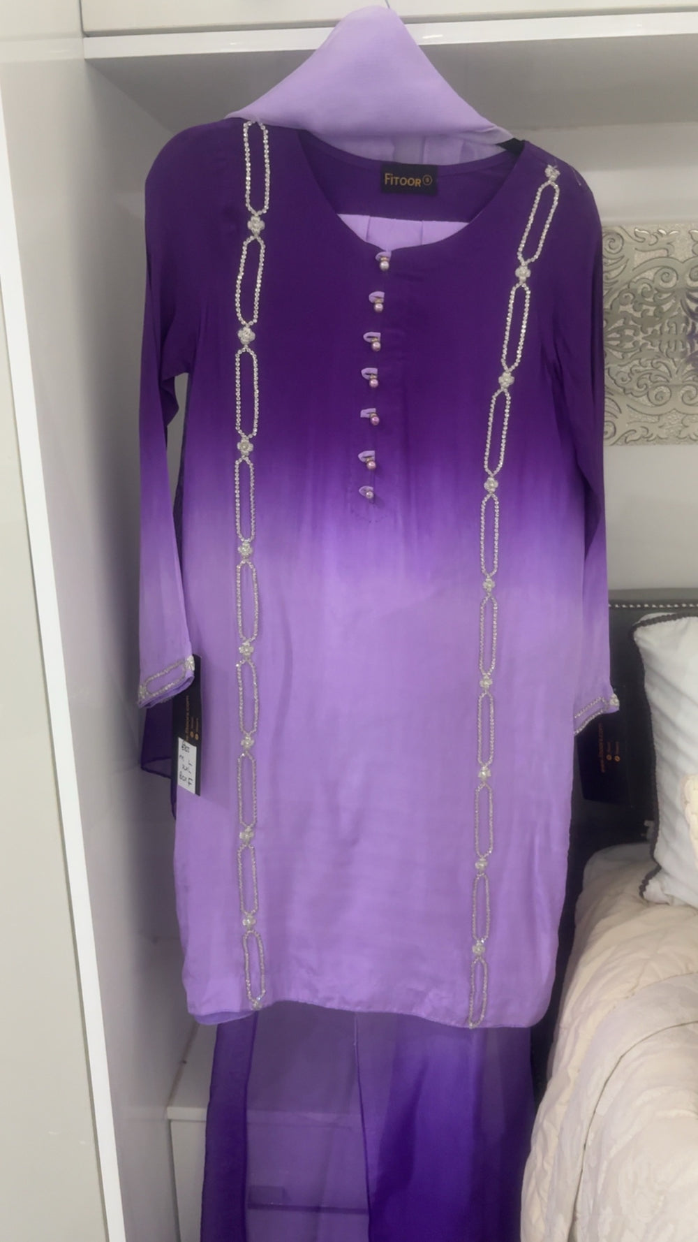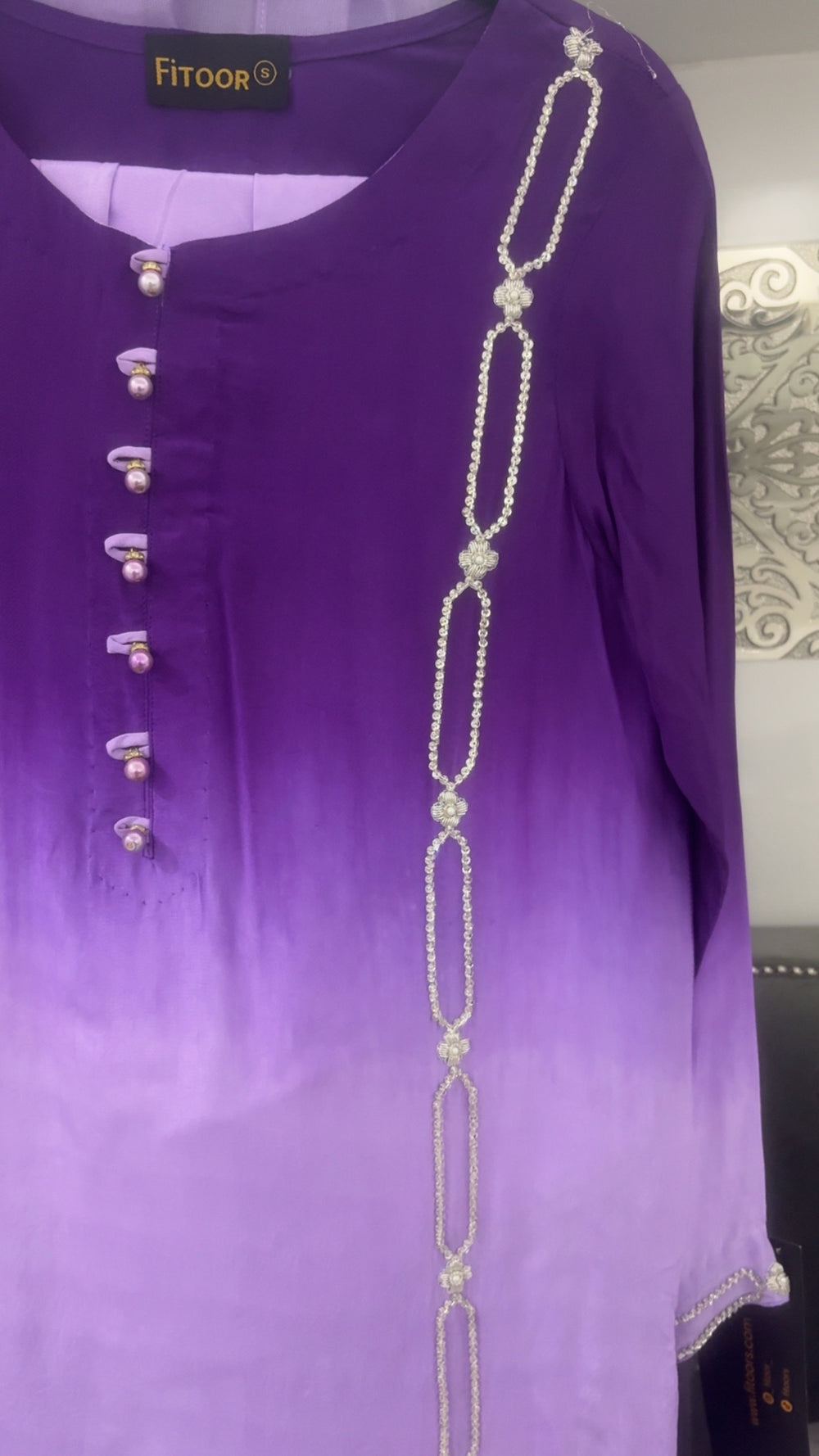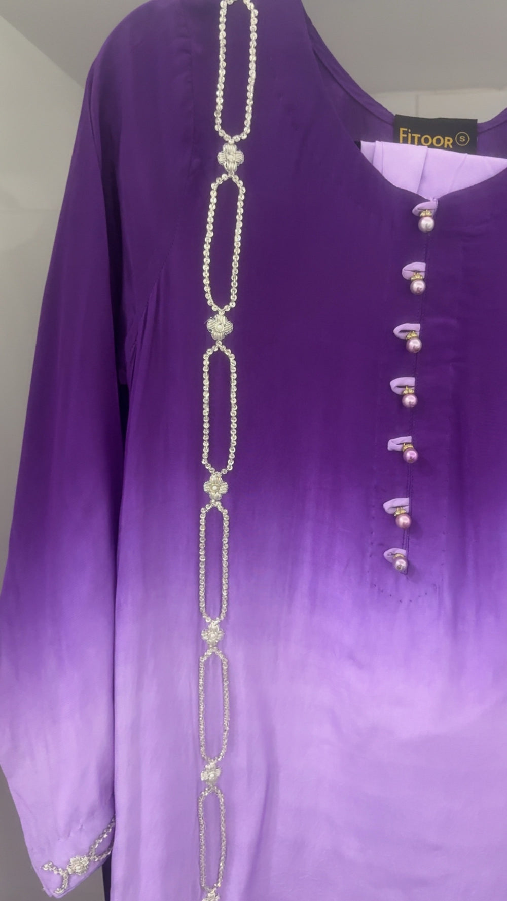 A stunning silk outfit featuring a graceful purple ombré kameez, adorned with intricate handwork and elegant button detailing along the neckline. The sleeves carry delicate hand embroidery, adding refinement to every gesture.