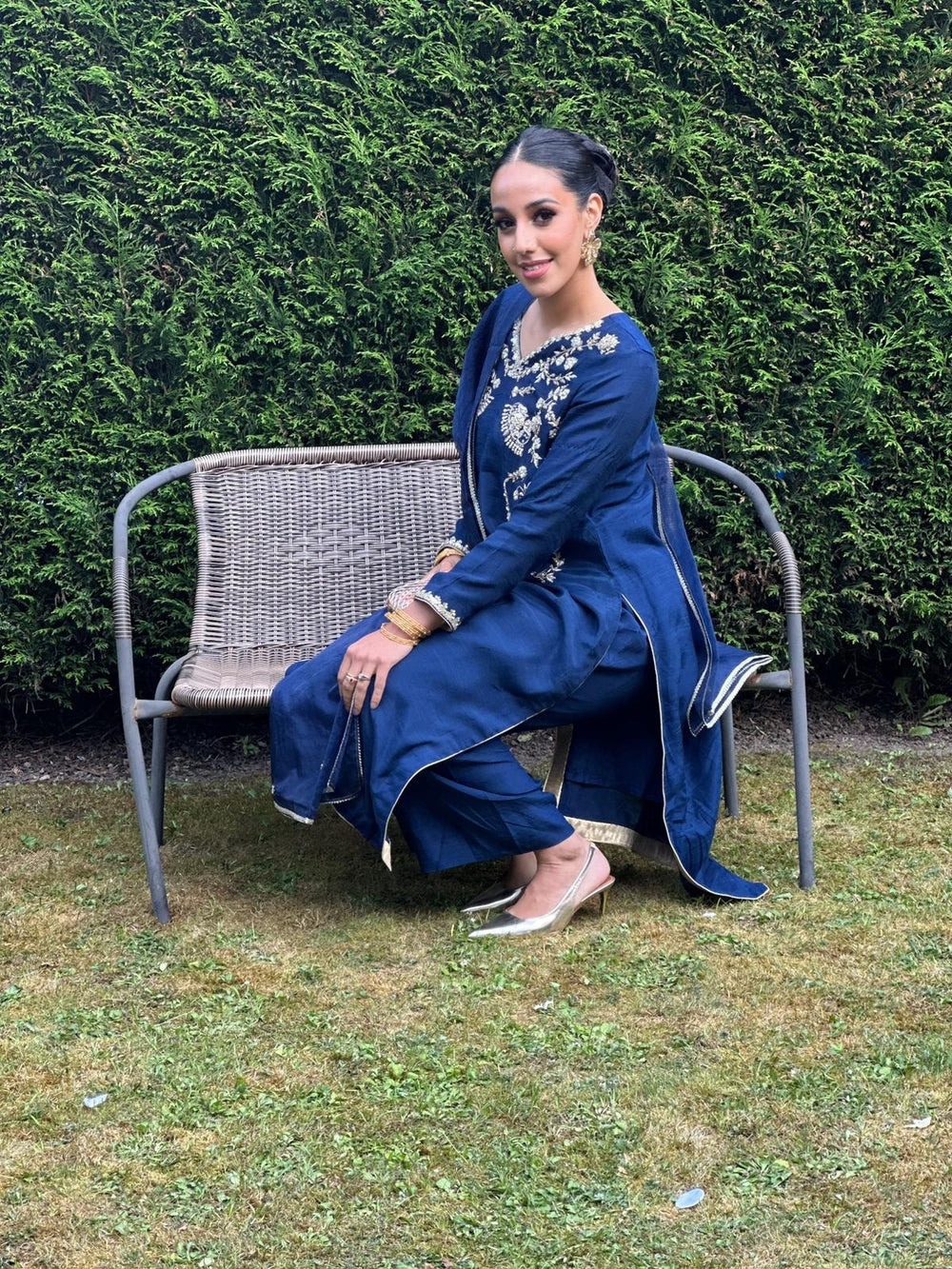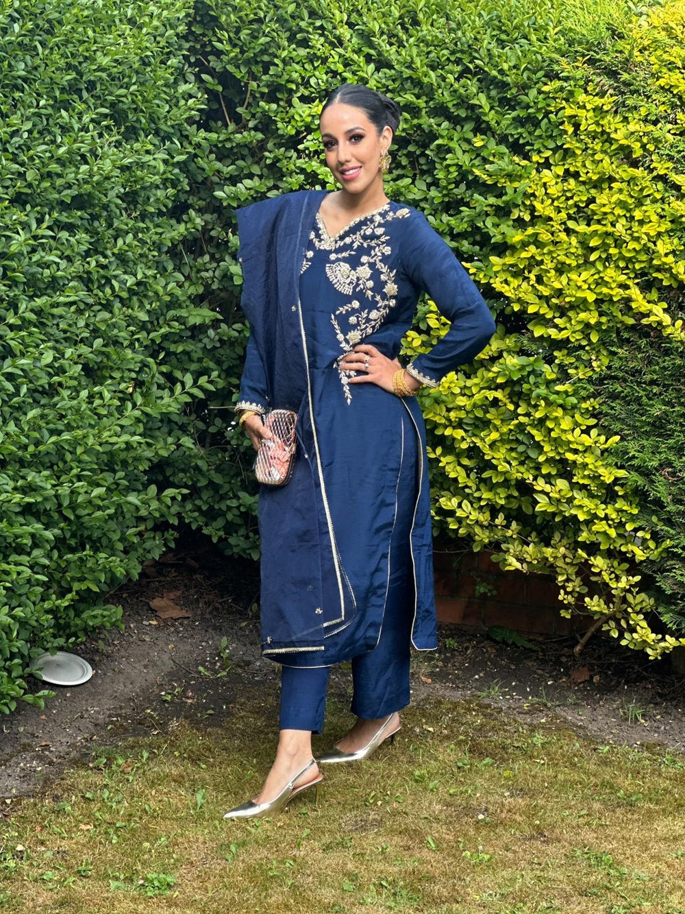 A sophisticated navy raw silk outfit featuring amazing, intricate handwork detailing around the neckline, crafted with precision to elevate the entire look with understated luxury.