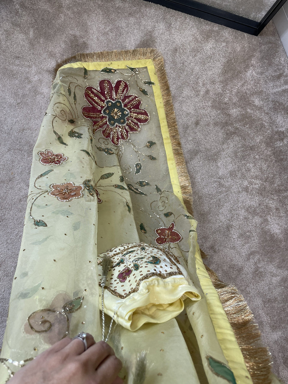 Scarf is hand-painted with heavy sequin, pearl, and gold embellishments – a true showstopper!