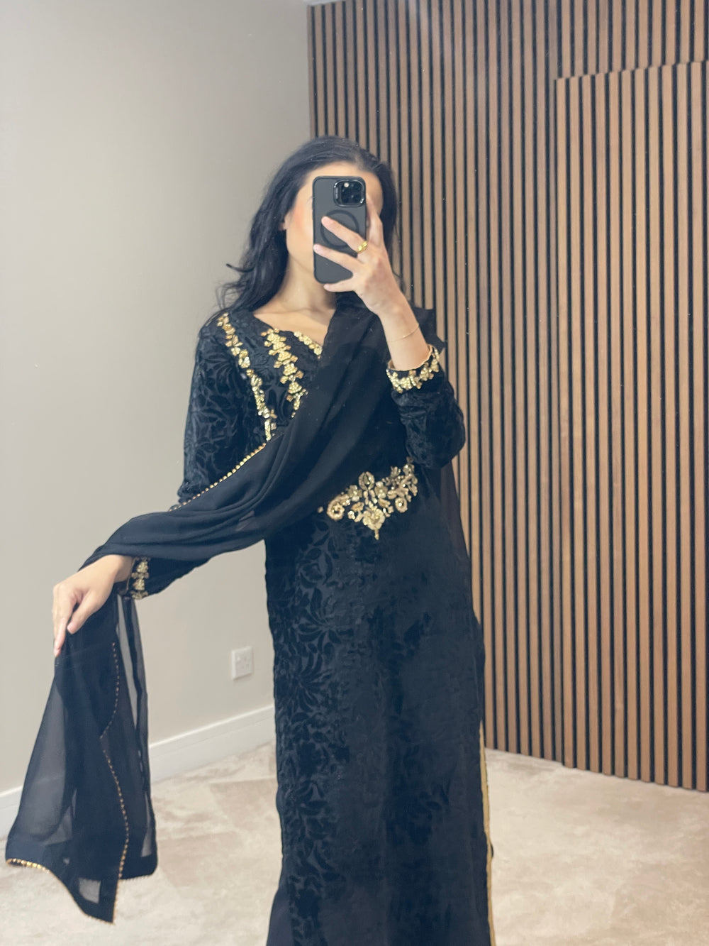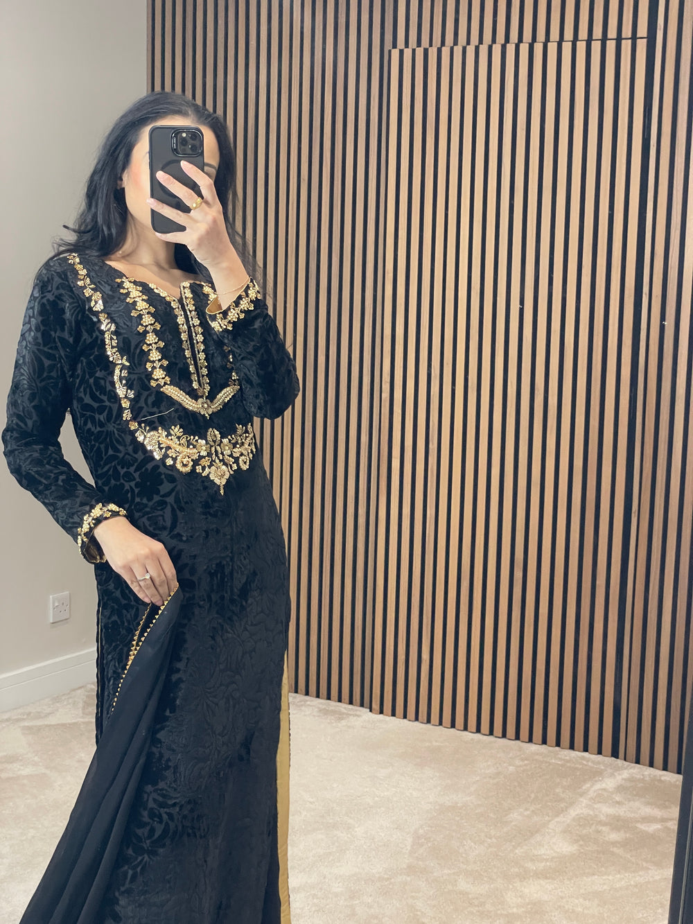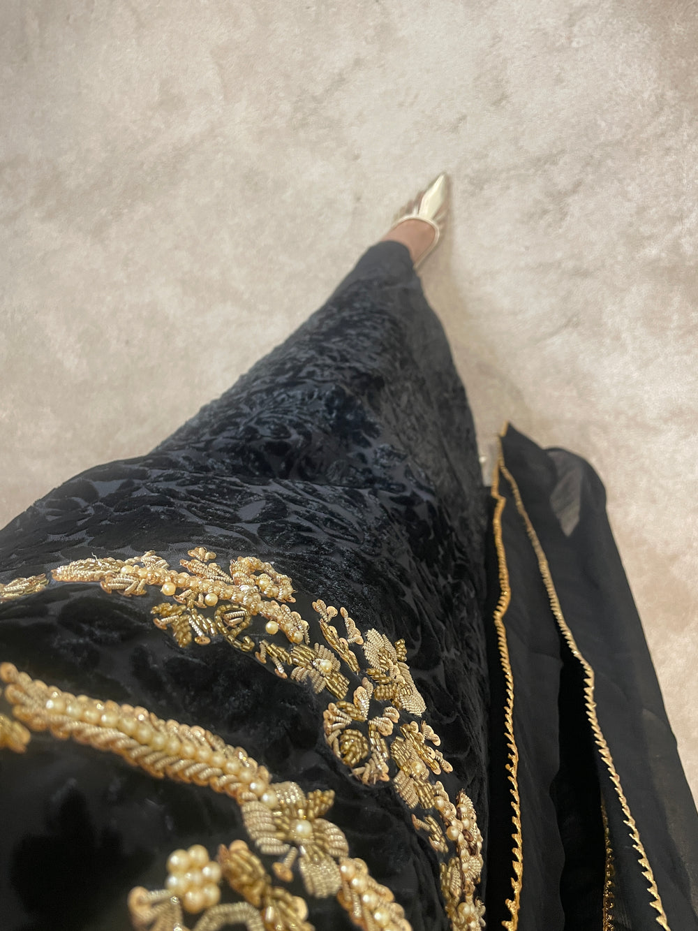 Beautiful black palachi outfit crafted from a trending fabric, featuring rich gold hand embroidery on the neckline and sleeves. Paired with sleek straight trousers and a lightweight chiffon scarf finished with delicate lace detailing.
