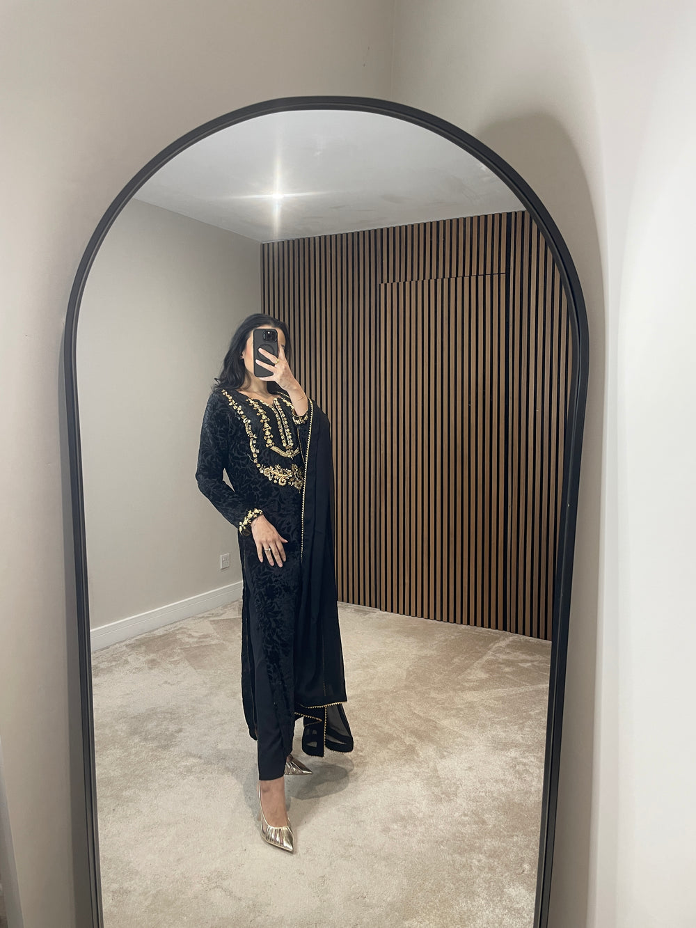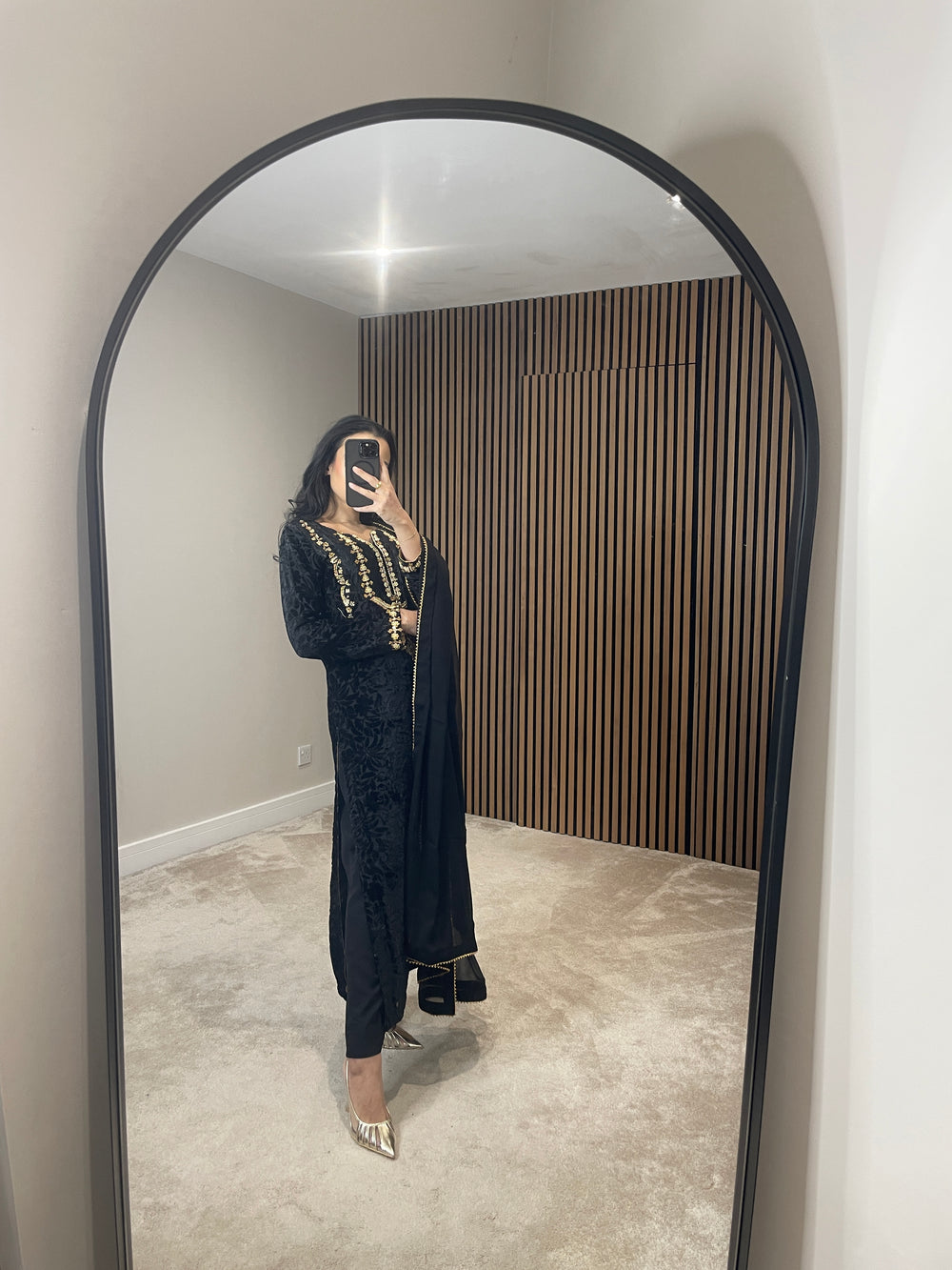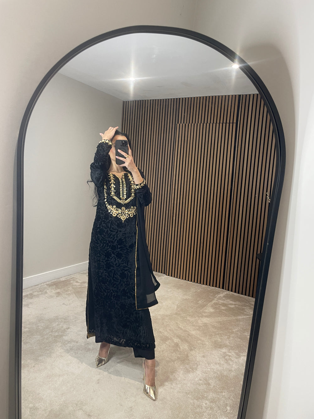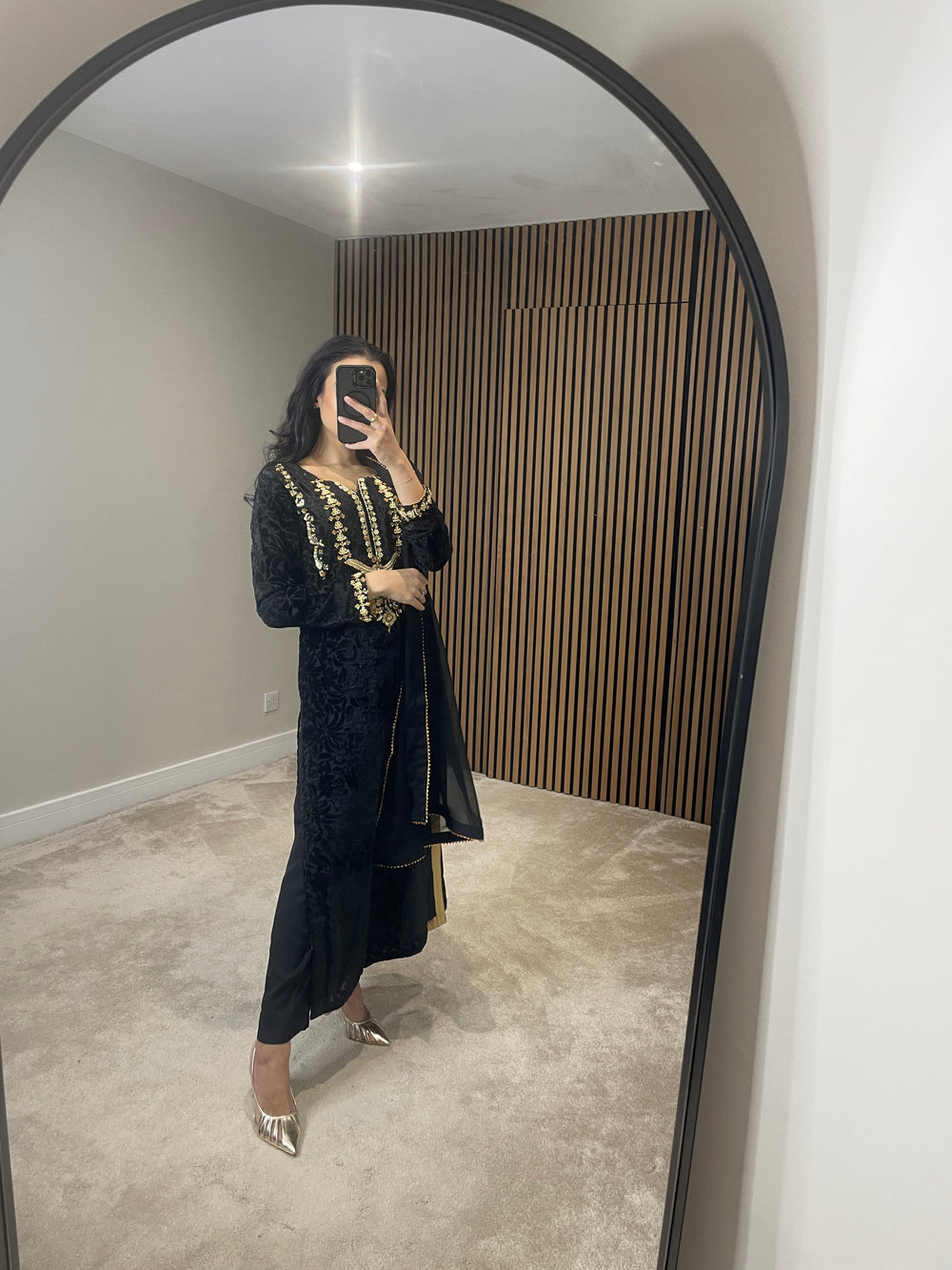 Beautiful black palachi outfit crafted from a trending fabric, featuring rich gold hand embroidery on the neckline and sleeves. Paired with sleek straight trousers and a lightweight chiffon scarf finished with delicate lace detailing.