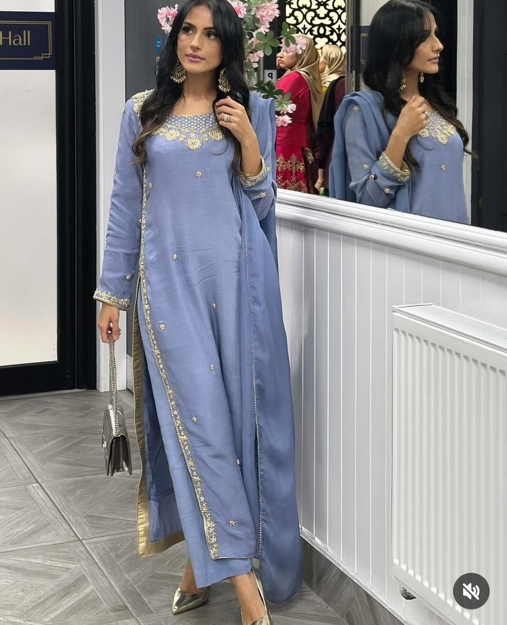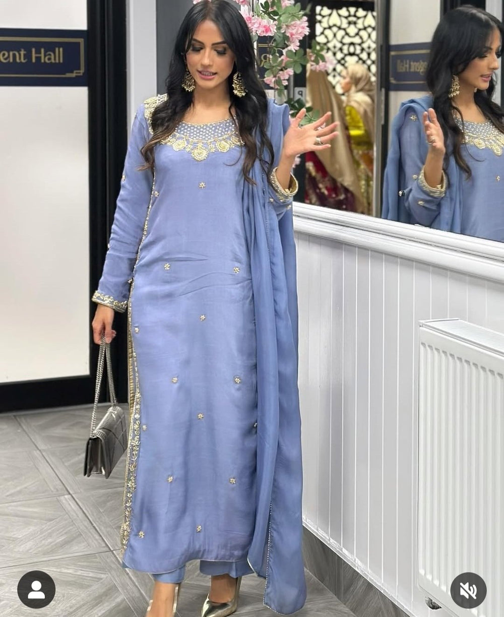 A Korean silk long kameez in lilac with intricate handwork on the neck, arms, and chalk (hem) will give a regal and sophisticated look. Pairing it with straight trousers ensures a sleek silhouette, while a chiffon scarf adds a touch of grace and flow to the outfit.