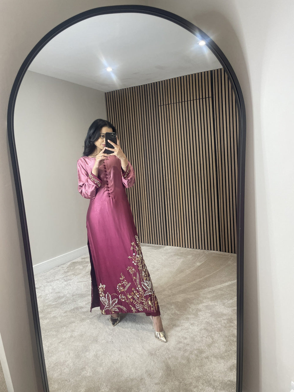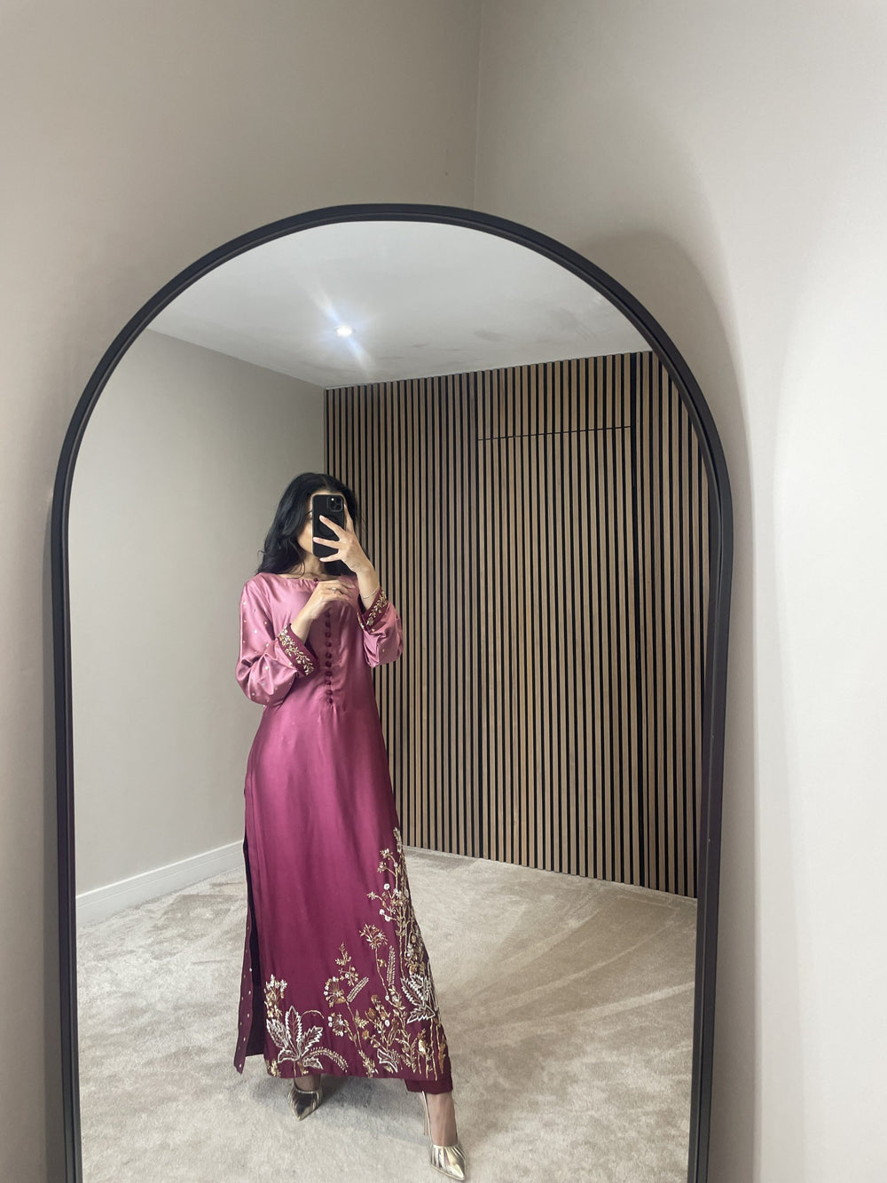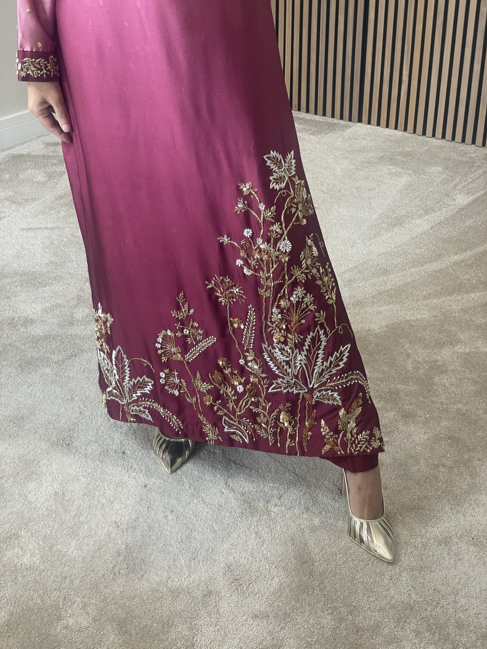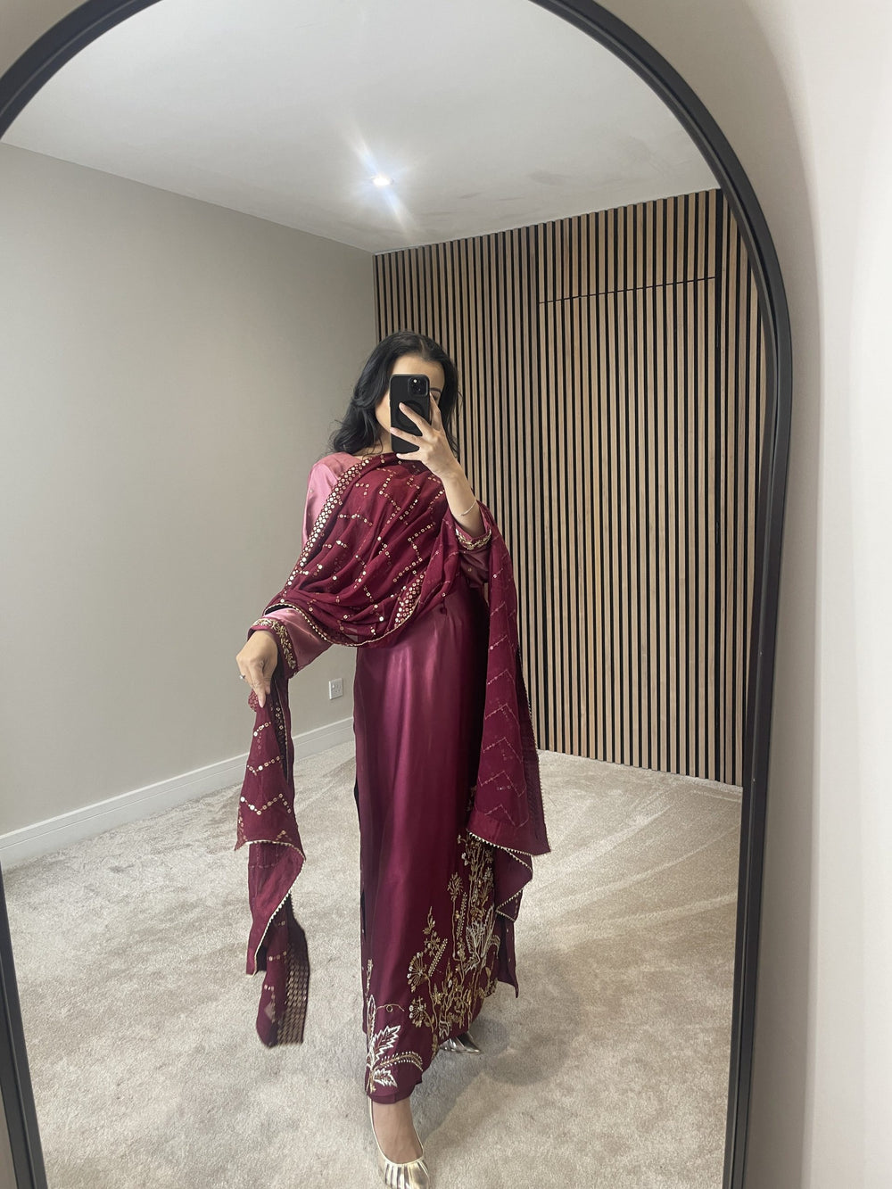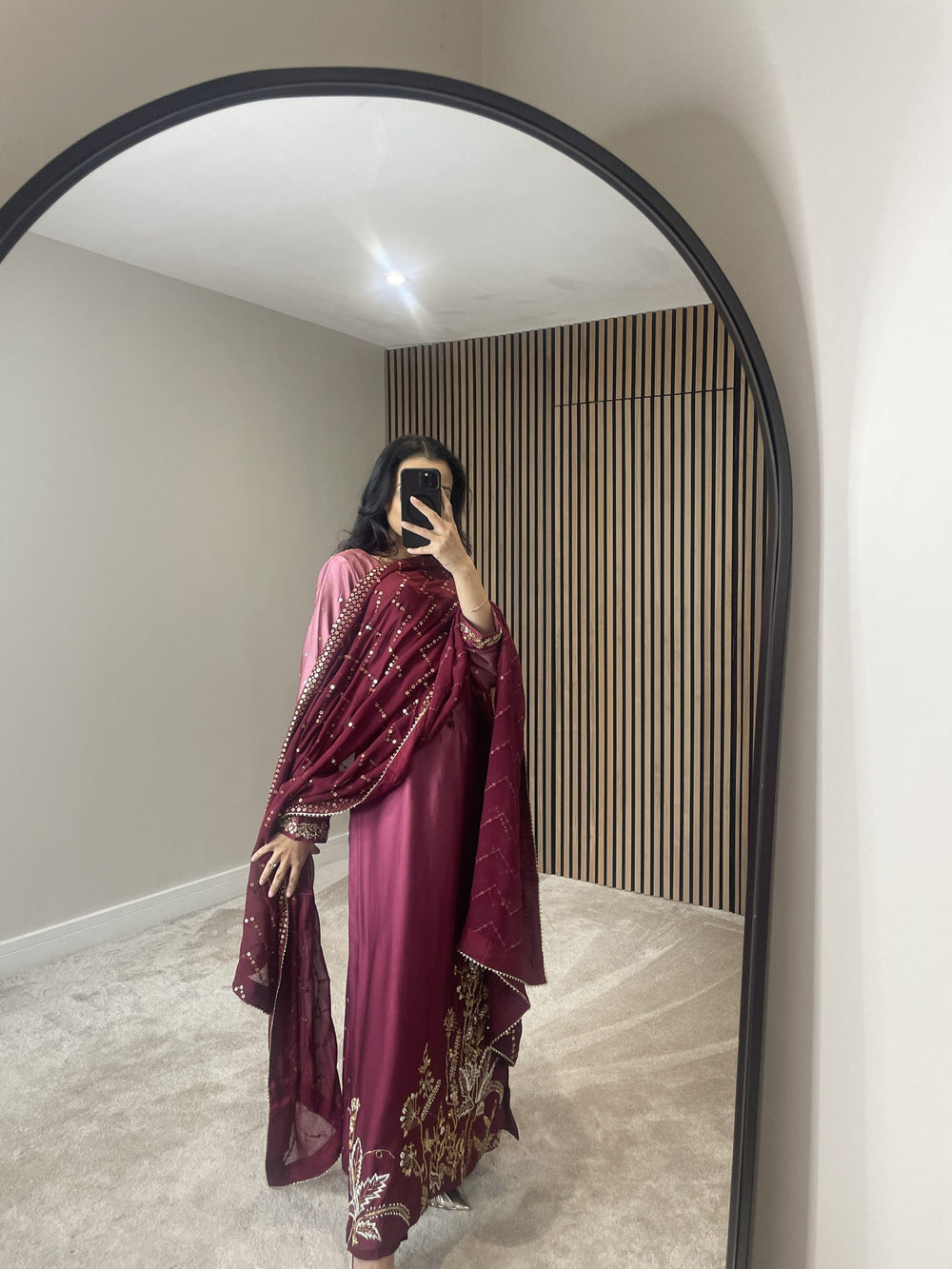 A beautifully crafted, elegant outfit with intricate hand embroidery and embellishments. The combination of tilla, ari work, pearls, and sequins on the daman (hem) of the kameez adds a luxurious touch, while the sequin chan (scattered sequins) on the back and sleeves enhances the overall glamour.