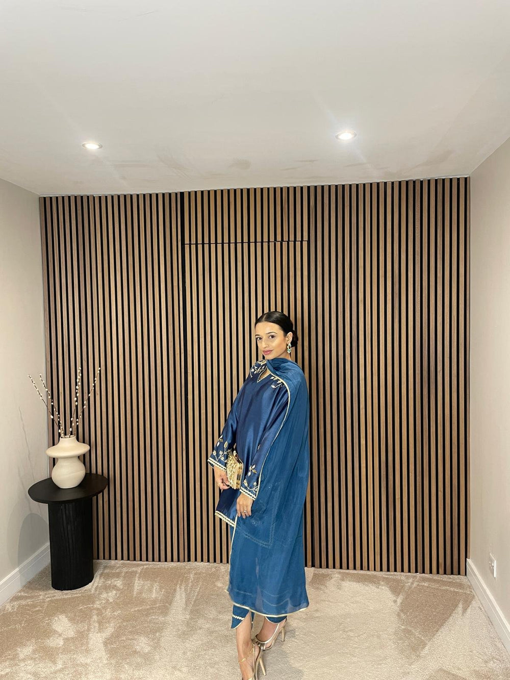 Turn heads in this stunning 3-piece raw silk outfit, crafted in a rich and elegant teal blue hue. The kameez features intricate embroidery on the shoulders, arms, and sides—delicately adorned with tila, sequins, and pearls for that perfect touch of shimmer. A graceful lace finish enhances the sides of the kameez, adding to its luxurious appeal. Paired with a flowing silk scarf trimmed in gold and stylish tulip trousers edged with gold lace, this ensemble is a flawless blend of tradition and modern flair.