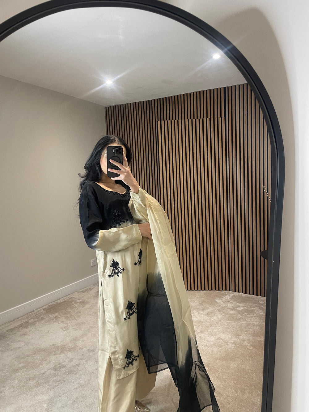 A refined silk outfit in a striking black-to-beige ombré, featuring black embellished handwork on the front of the kameez and around the neckline. The intricate detailing adds depth, contrast, and elegance to the entire look.