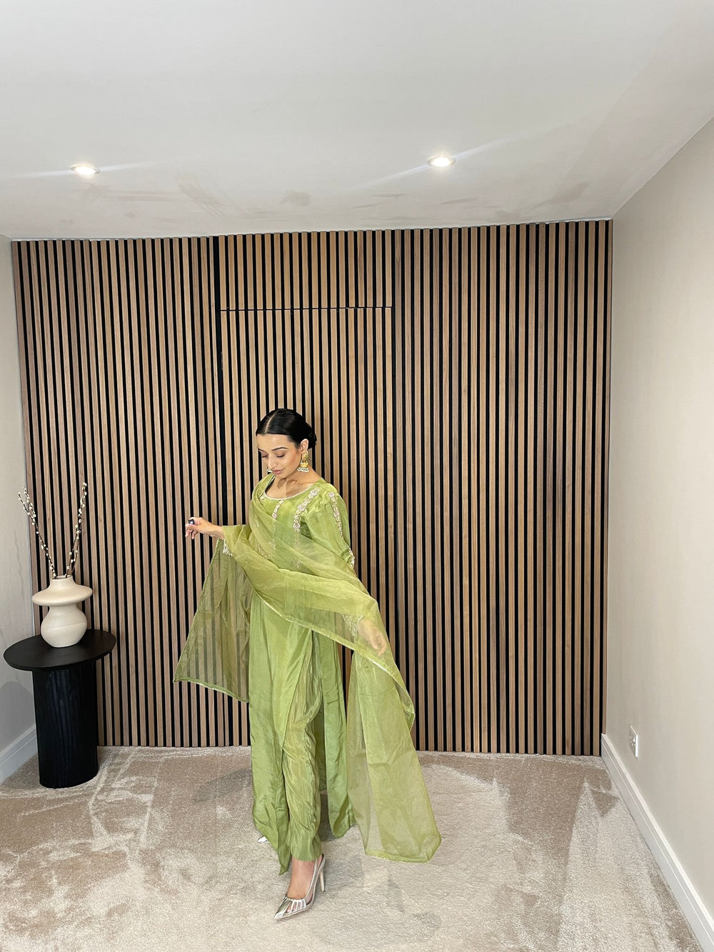 The look is completed with a delicately detailed organza scarf, adding a touch of ethereal charm to this stunning outfit. Perfect for formal occasions, festive gatherings, or when you simply want to make a statement.