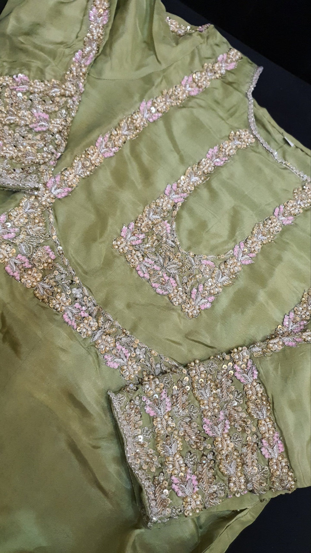 Step into timeless elegance with this luxurious Sheesha silk ensemble, masterfully crafted to turn heads. The kameez features intricate embellishments on the neckline and sleeves, showcasing meticulous handwork in pearls, stones, dabka, and ari embroidery for a regal finish. Measuring approximately 54 inches in length, it offers a graceful silhouette with straight-cut trousers for a modern edge.