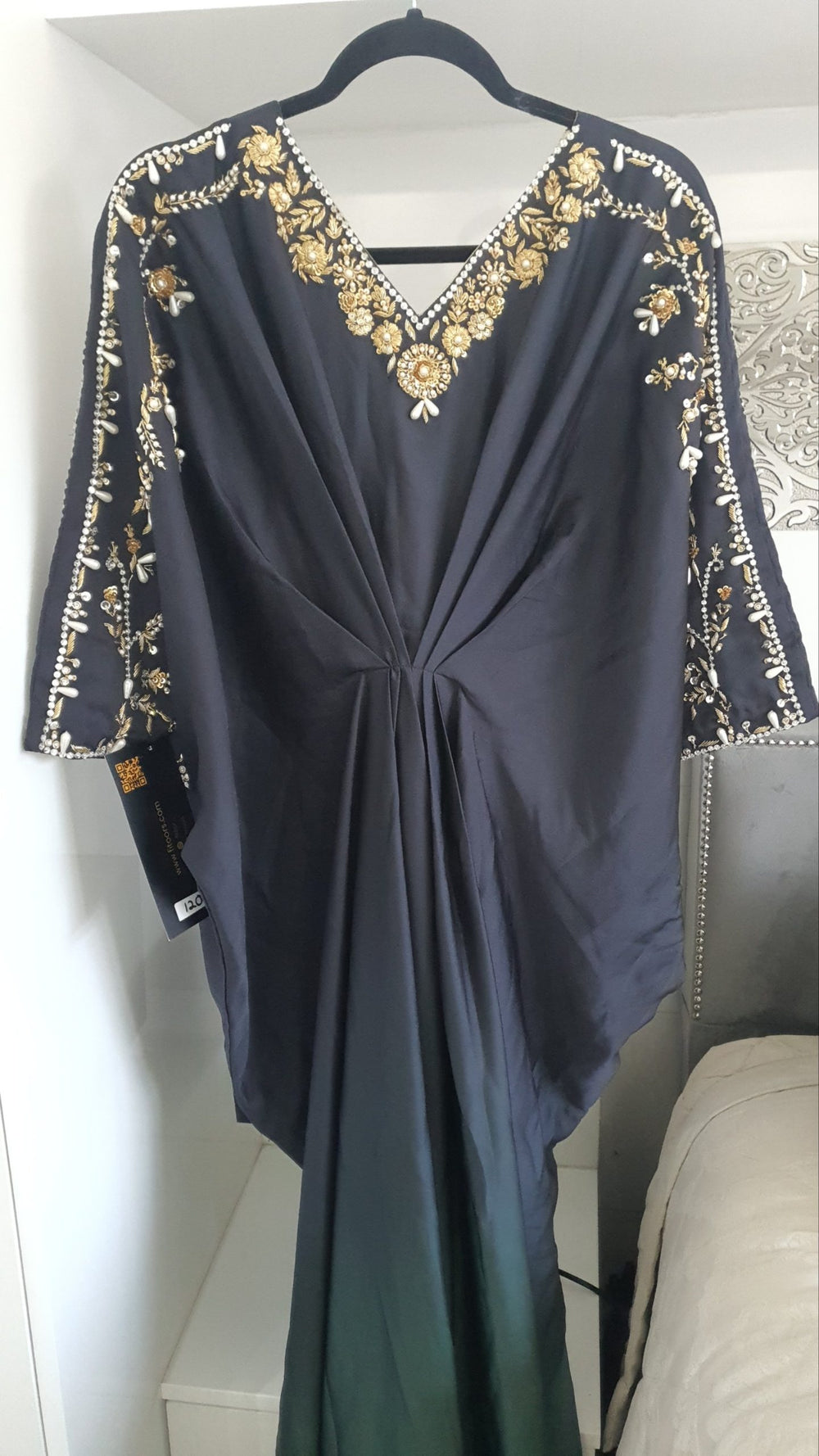 A luxurious peacock ombre kaftan with gold embroidery and pearl and green stone embellishments on the neck and arms is perfect for an elegant and regal look. The 55-inch length makes it a graceful, flowing piece, and since it fits up to large, it offers a comfortable yet stylish fit. The small slits on each side add a touch of ease and movement, making it even more flattering