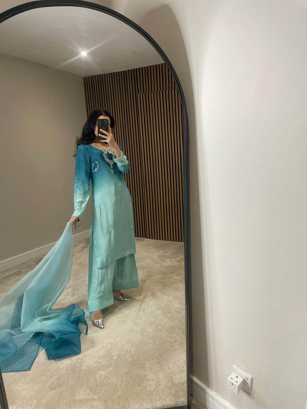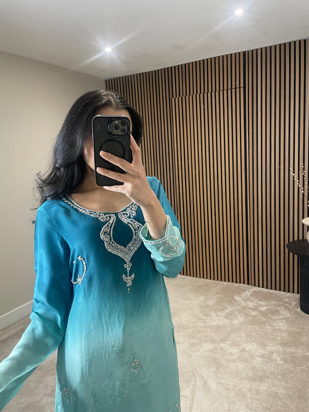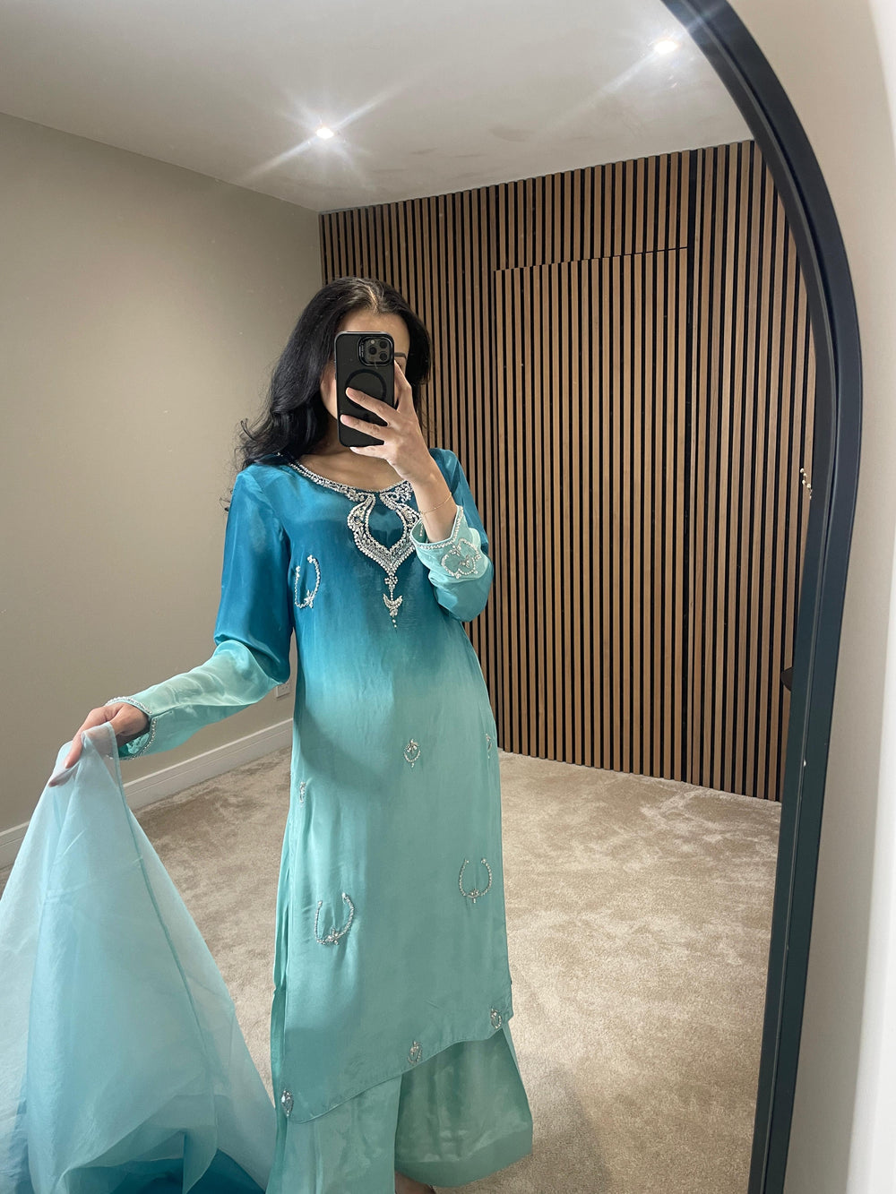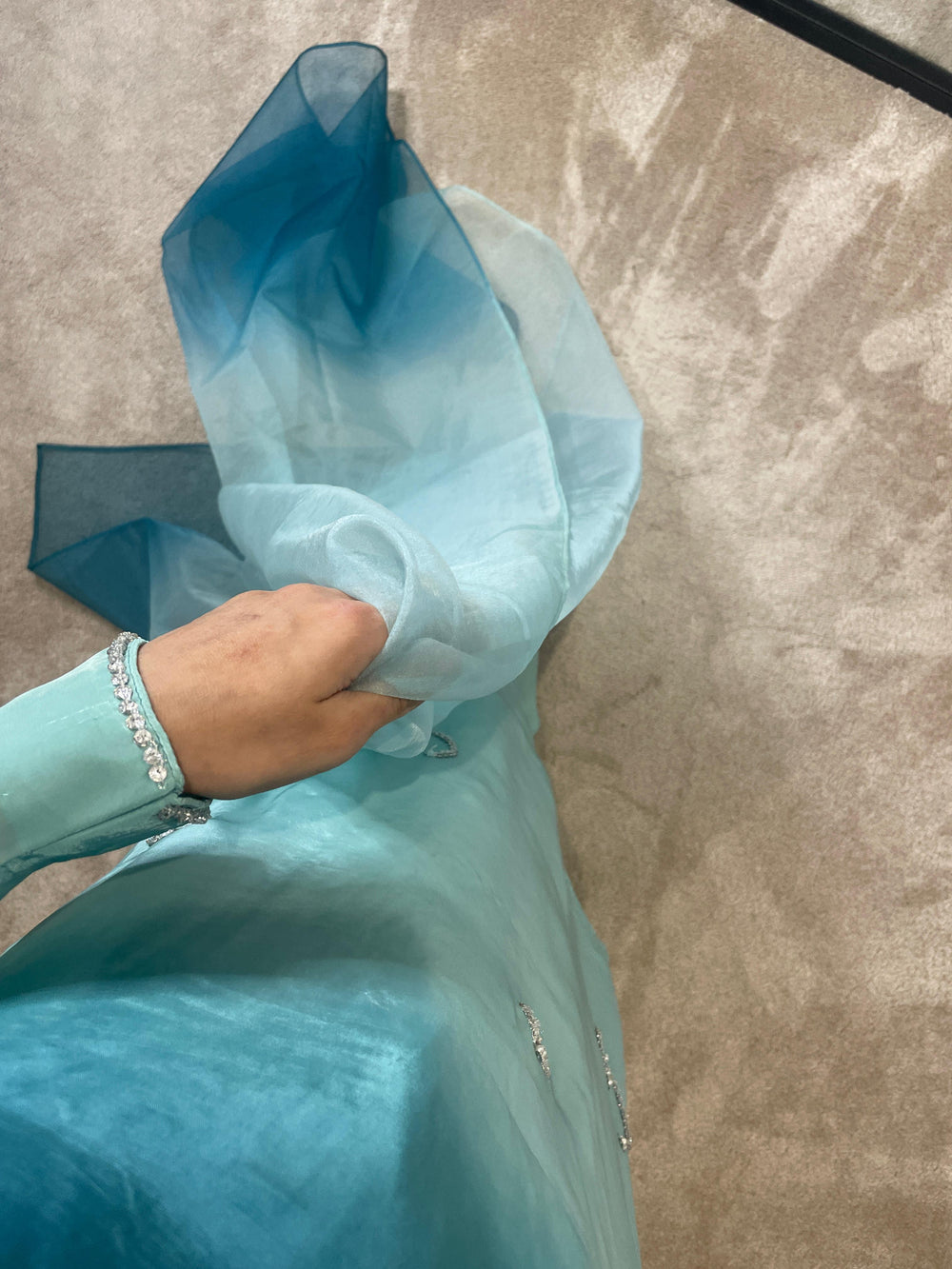 A captivating silk outfit in a soothing turquoise ombré, featuring beautiful handwork on the front of the kameez and along the arms. Every detail showcases craftsmanship and elegance.