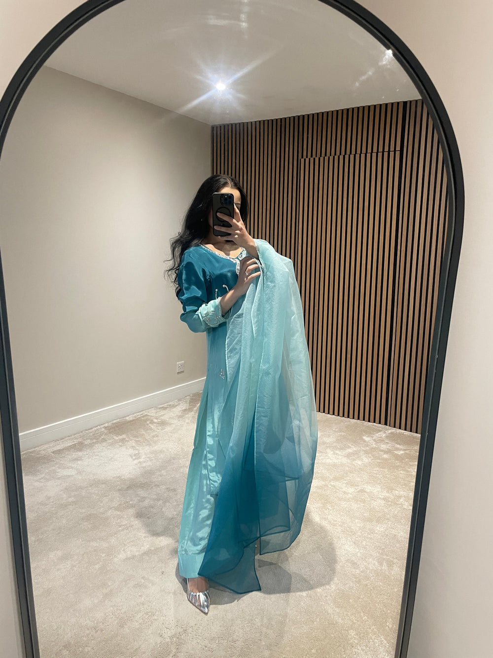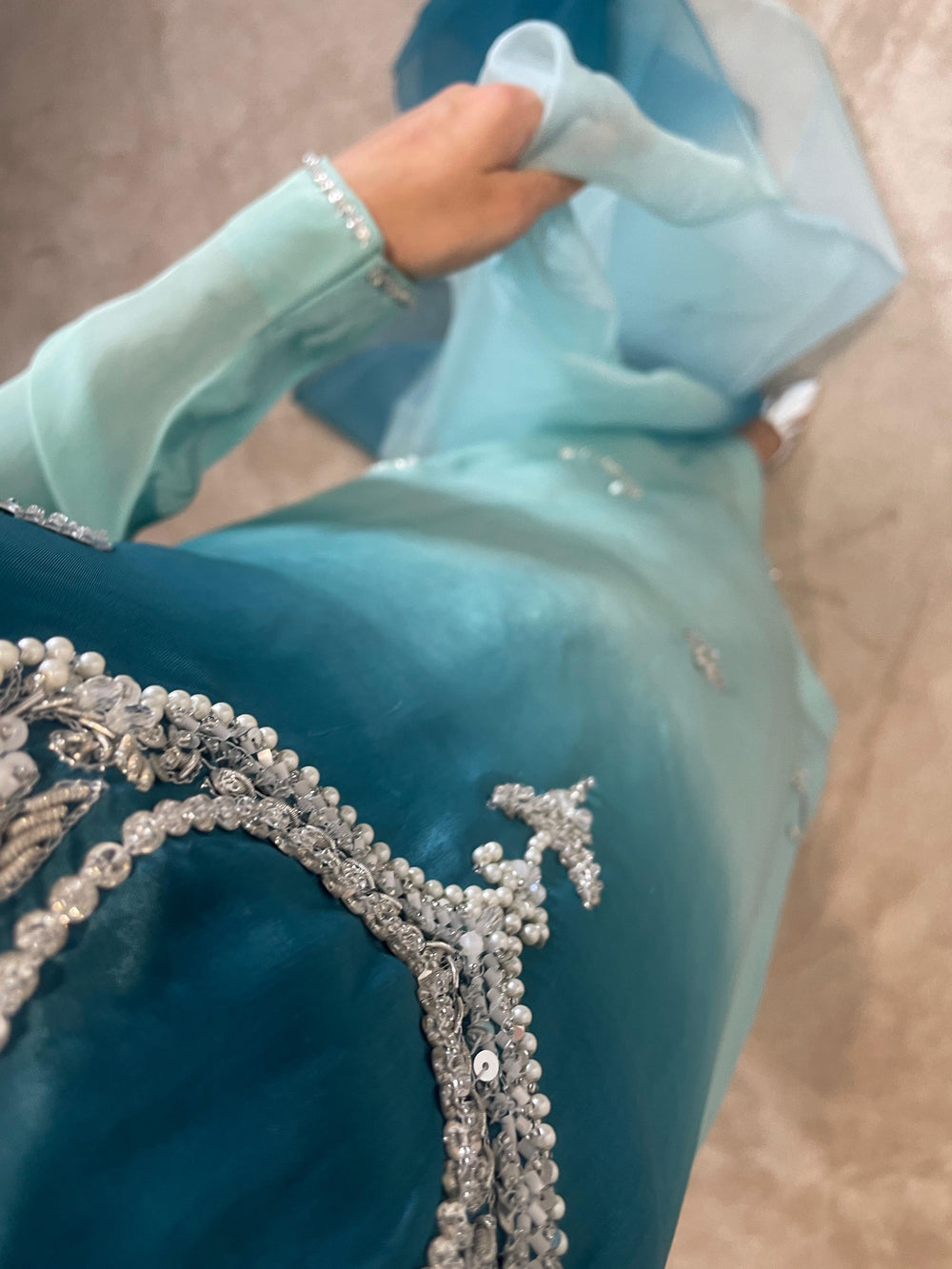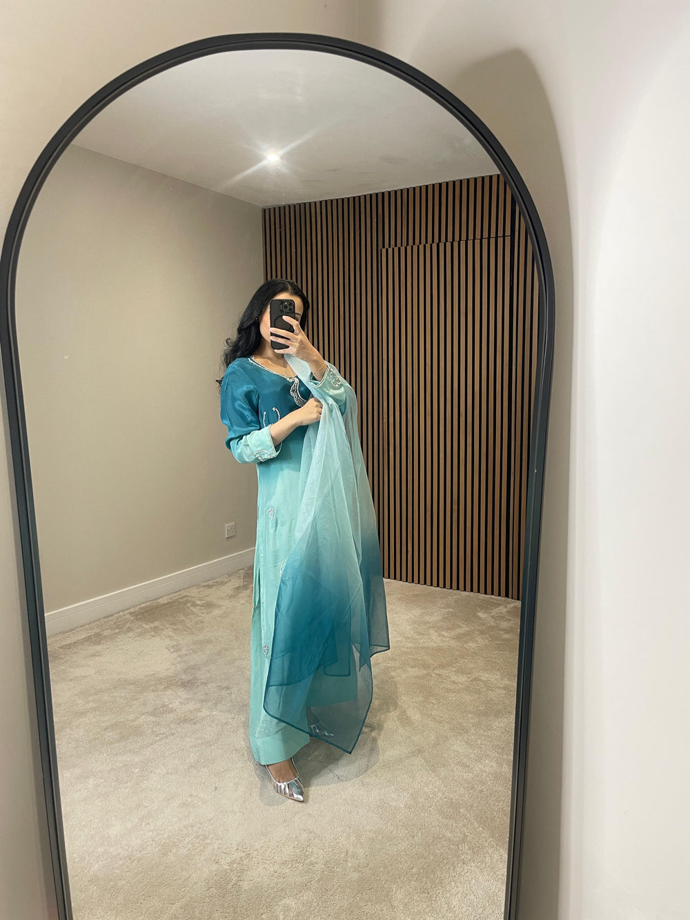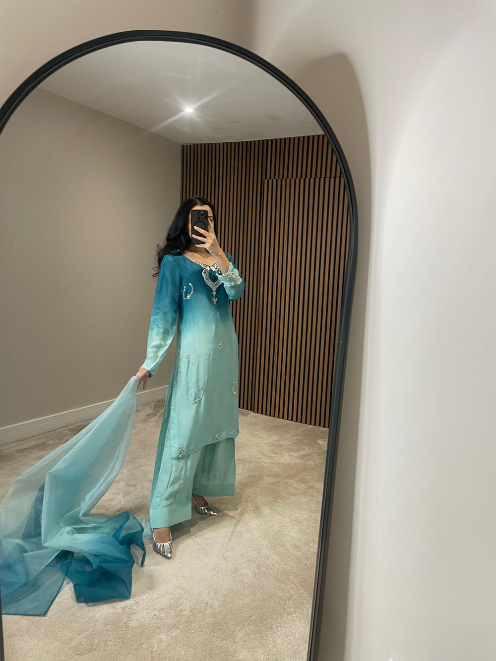 A captivating silk outfit in a soothing turquoise ombré, featuring beautiful handwork on the front of the kameez and along the arms. Every detail showcases craftsmanship and elegance.