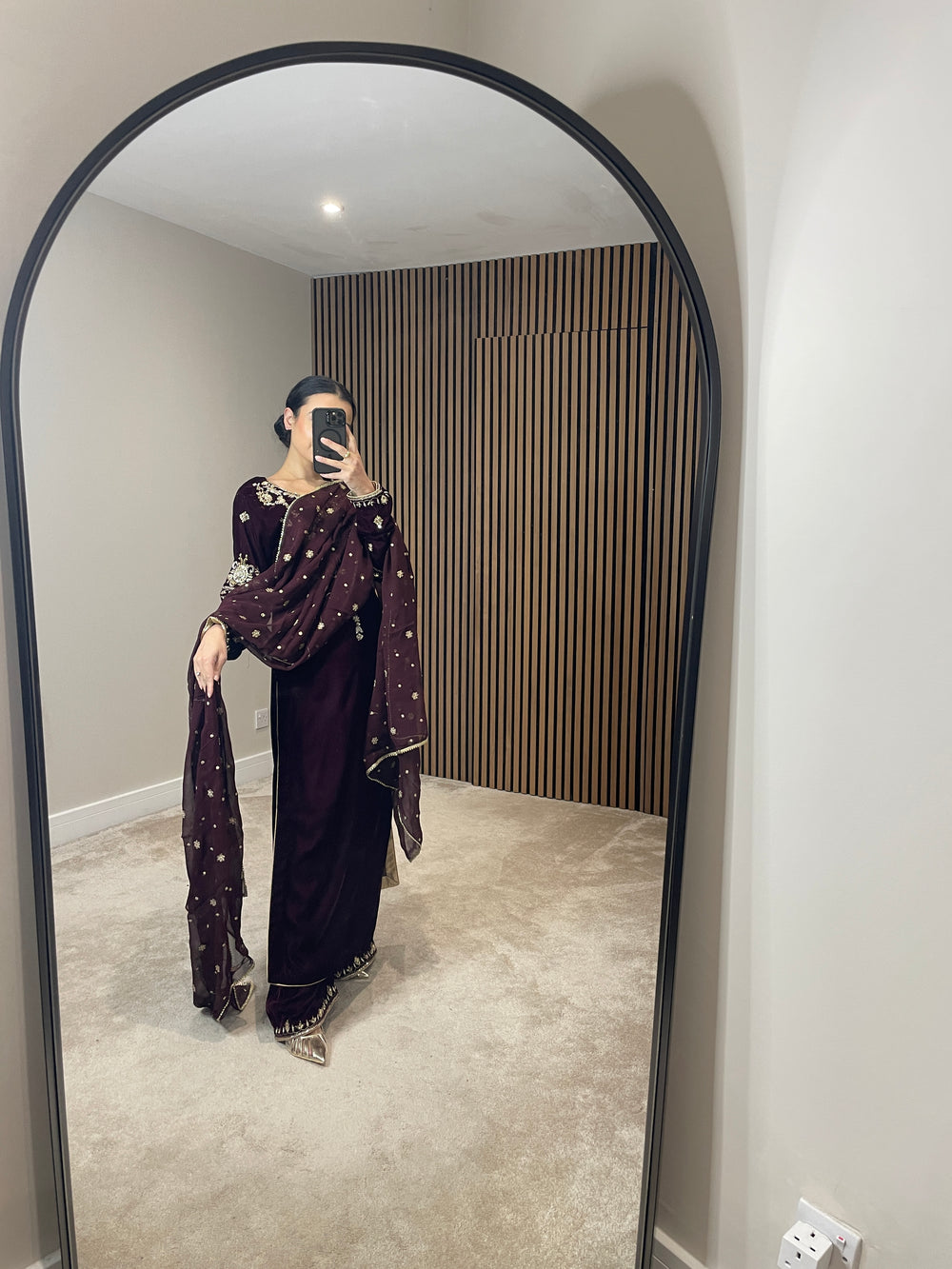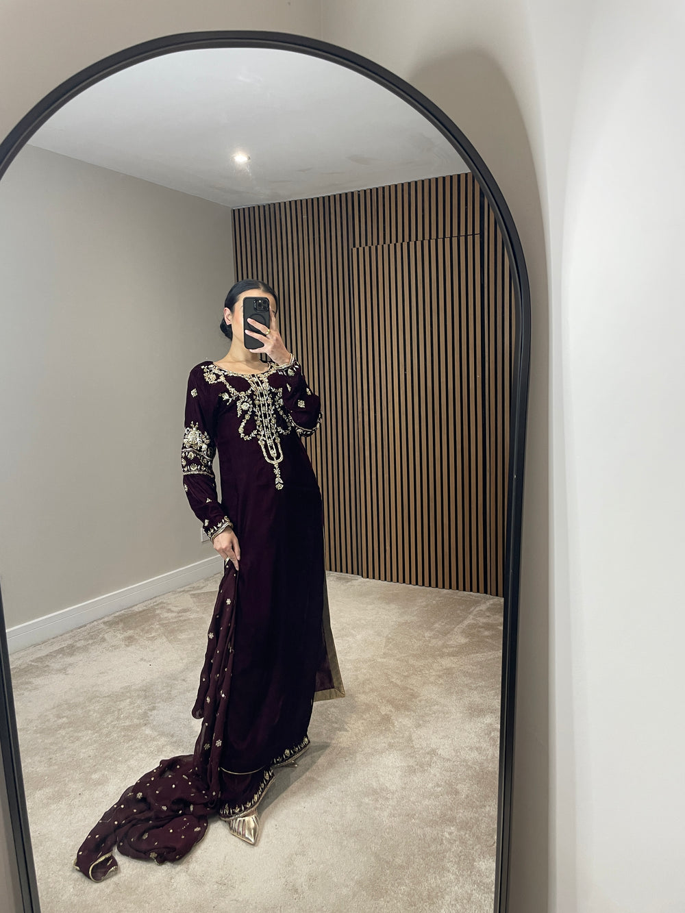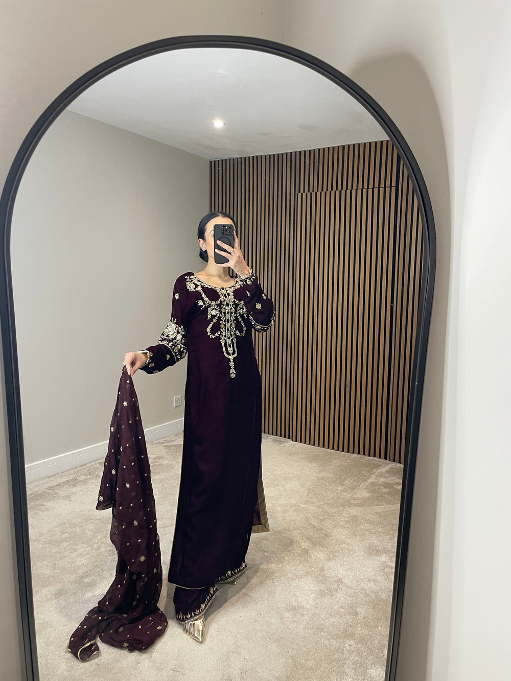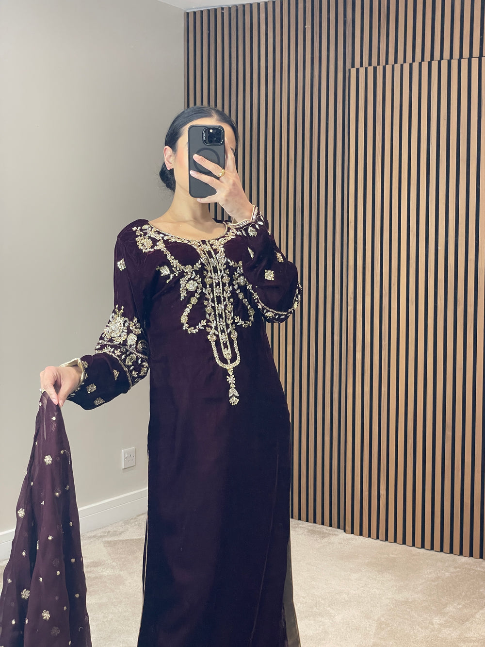 Beautiful deep maroon velvet attire featuring exquisite, heavy handwork on the neckline and sleeves with intricate detailing. Styled with wide-leg trousers adorned with elegant hand-printed detailing at the hem, and paired with a chiffon scarf highlighted by delicate gold thread motifs.