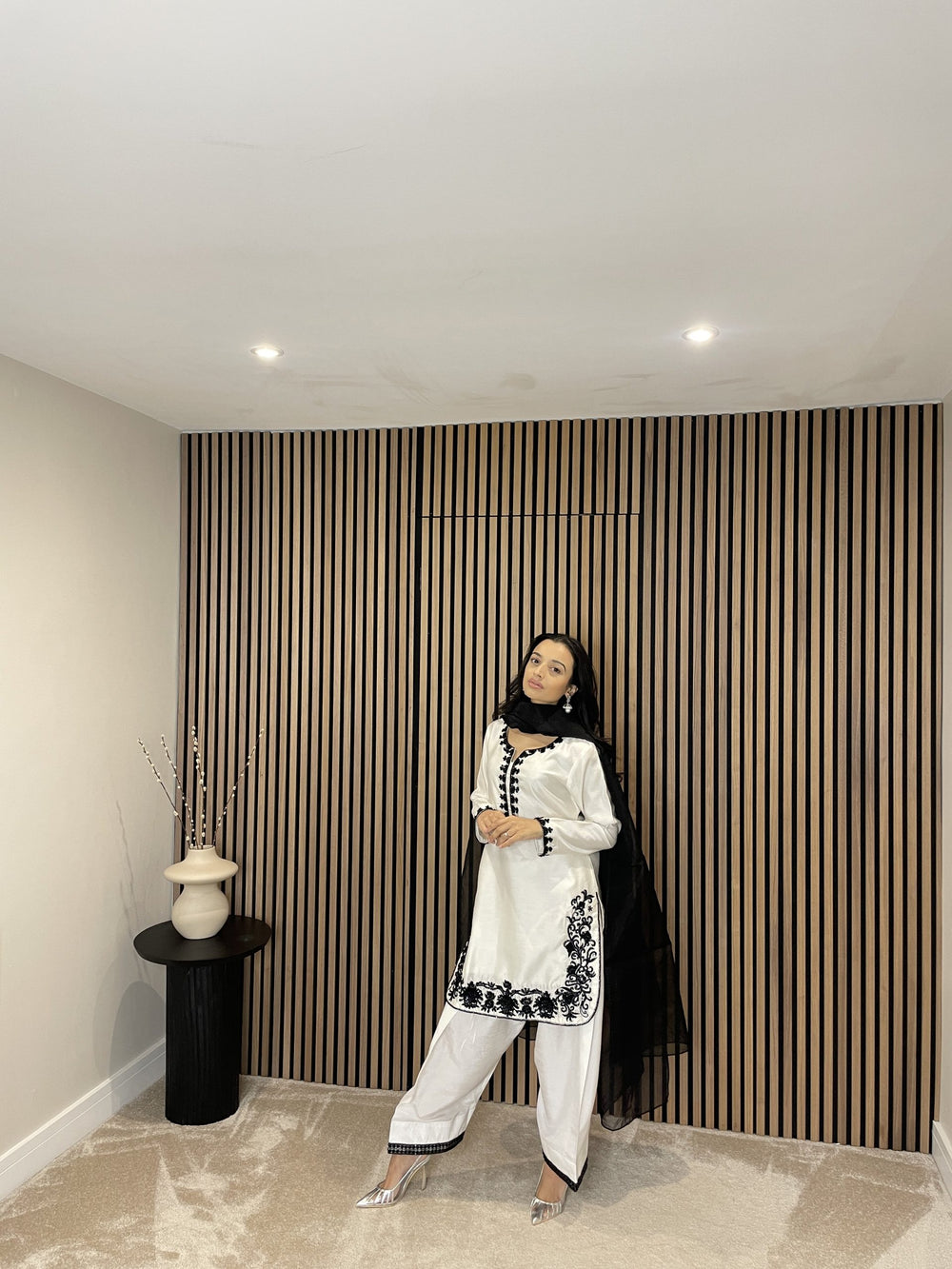 Absolutely gorgeous and elegant outfit! The combination of white raw silk with sequin cut dana and black crystal & dabka work creates a luxurious contrast, perfect for formal occasions. The detailing on the neck, arms, daman, and chalks adds a regal touch.