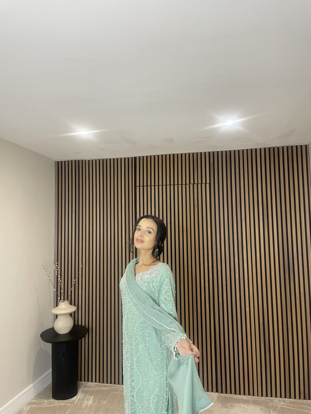 A stunning heavy mint catdana ensemble adorned with delicate pearls, perfect for a festive or formal occasion. The neckline features a cute, feminine design that adds a charming touch. The daman is richly embellished with intricate handwork, mirrored on both the front and back for a luxurious, symmetrical look. Sleeves are also fully adorned to match the ornate daman.
