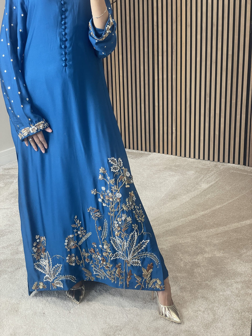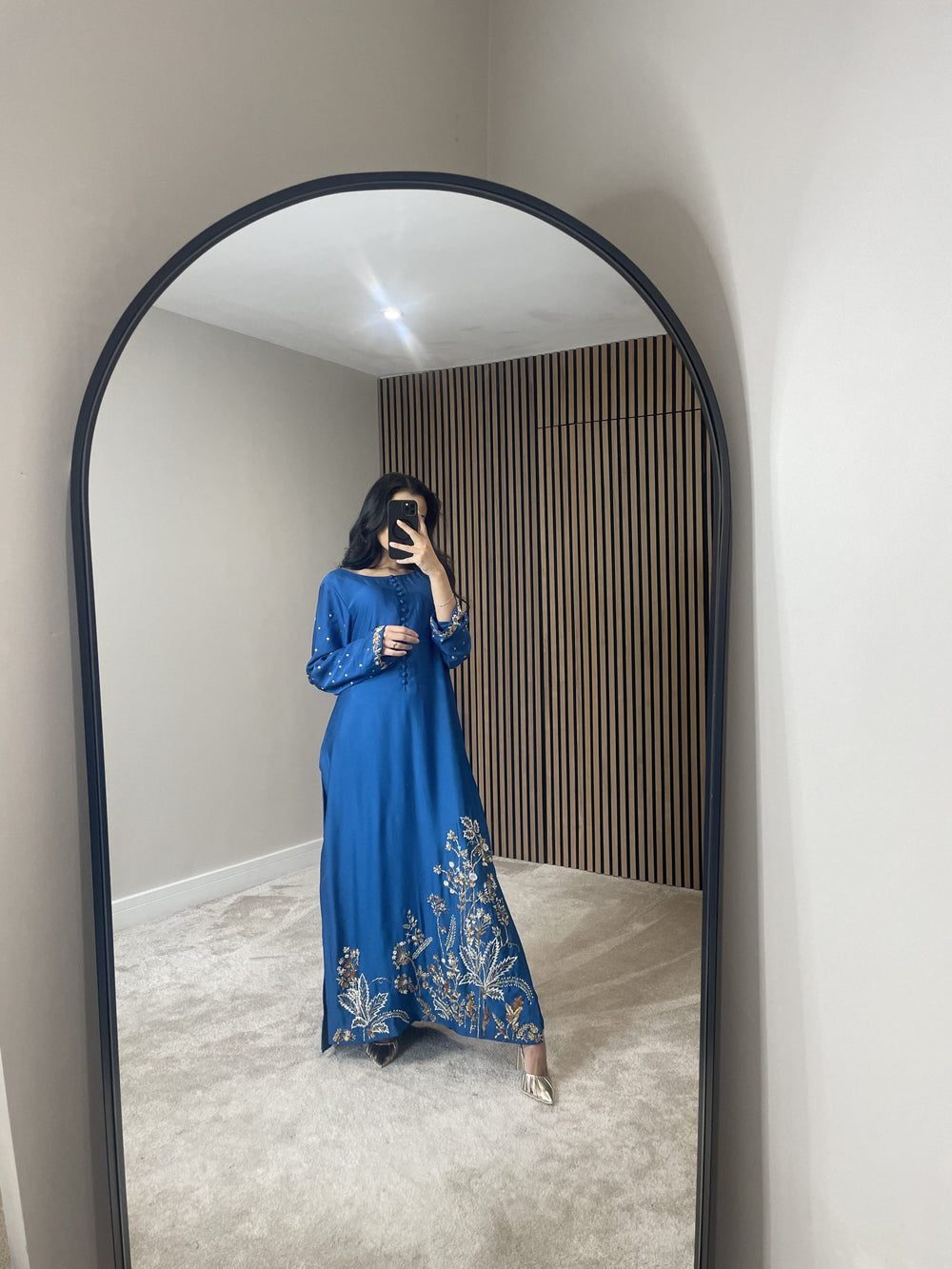 Noor is a beautifully crafted, elegant outfit with intricate hand embroidery and embellishments. The combination of tilla, ari work, pearls, and sequins on the daman (hem) of the kameez adds a luxurious touch, while the sequin chan (scattered sequins) on the back and sleeves enhances the overall glamour.