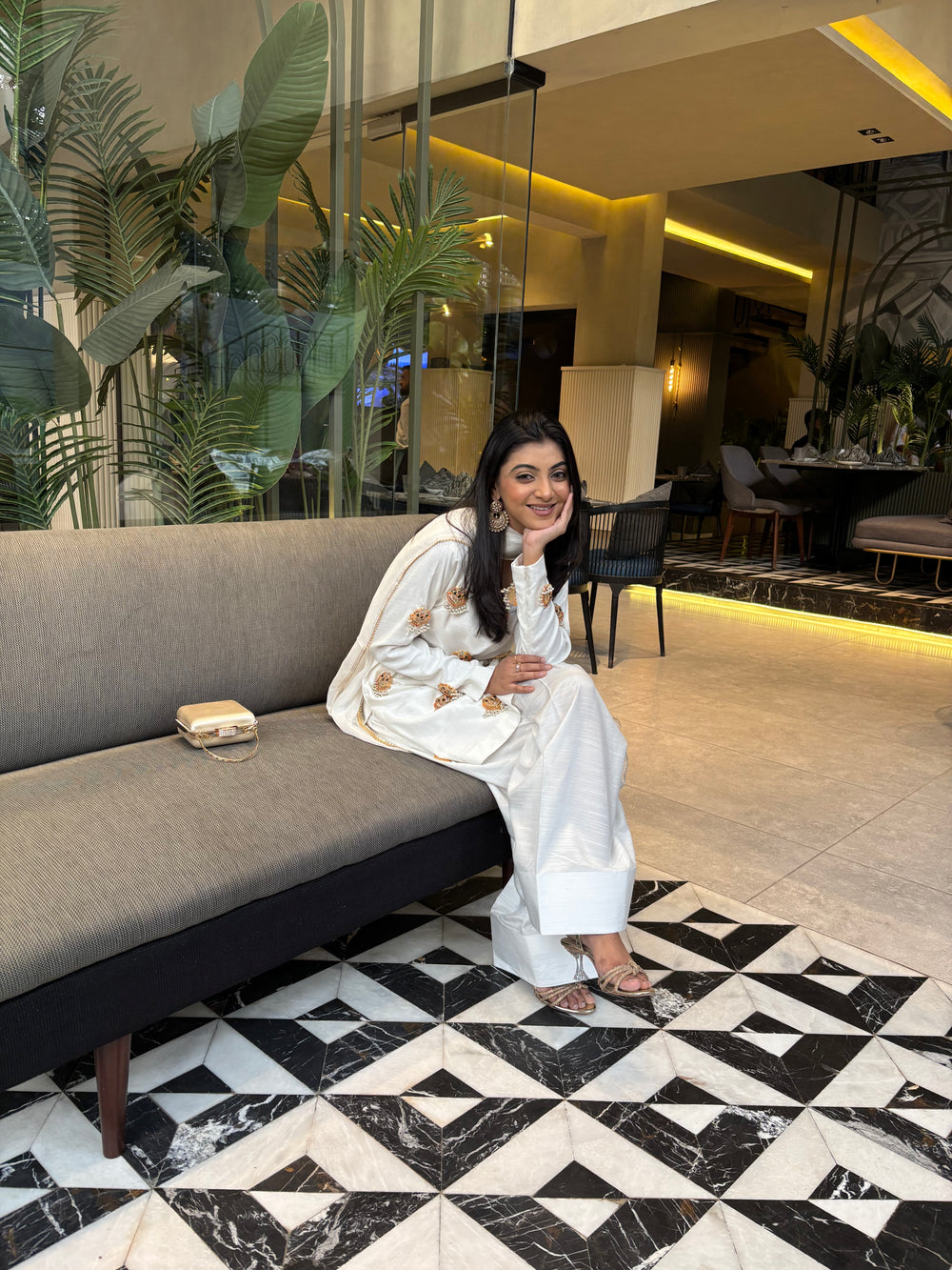 The kameez is adorned with delicate jewellery embellishments along the front and sleeves, adding a touch of glamour. Stylish zip detailing on the arms and side enhances the overall finish with a modern edge. Paired with classic farshi trousers, the look is completed with a silk scarf that adds effortless elegance.