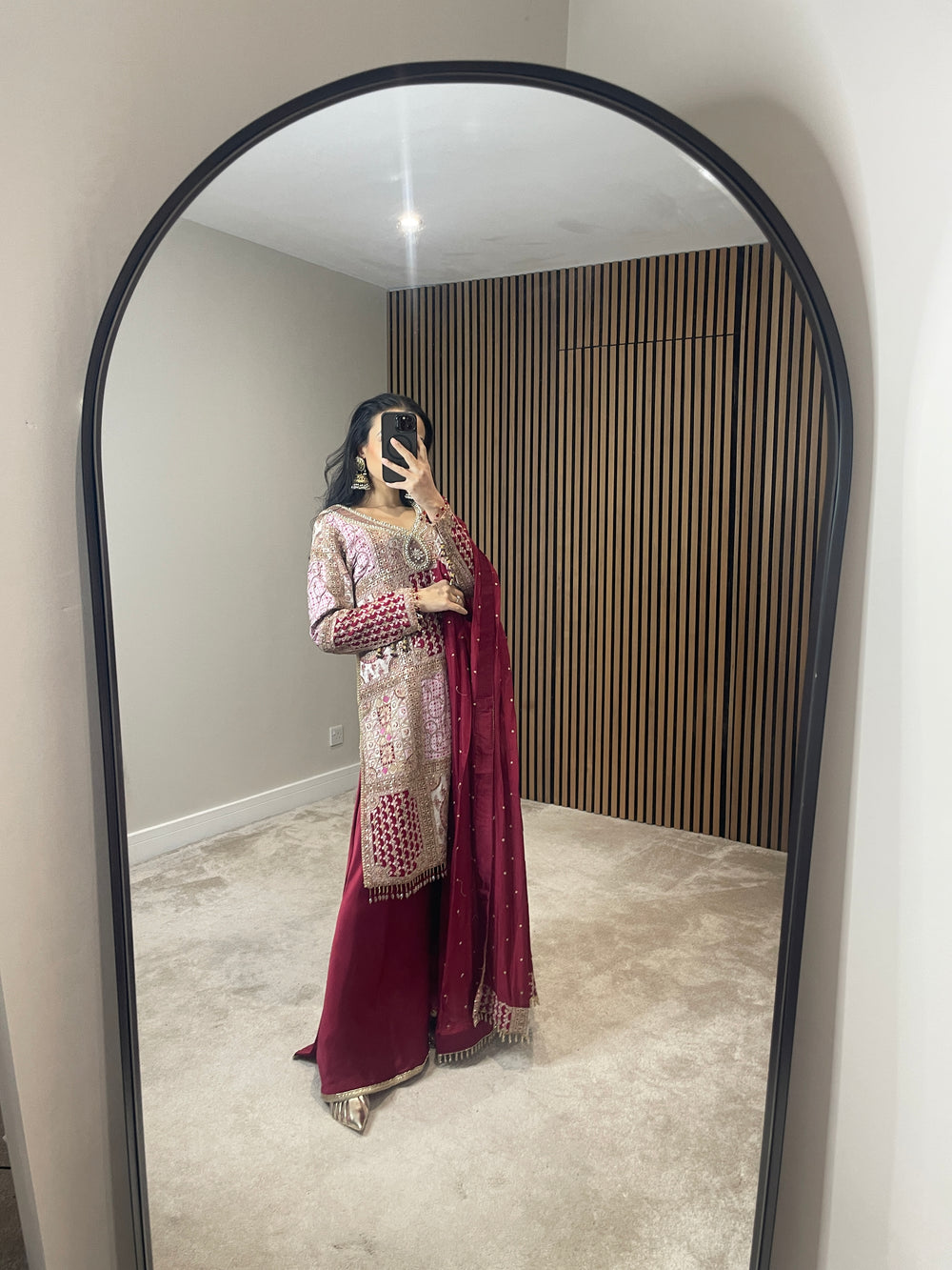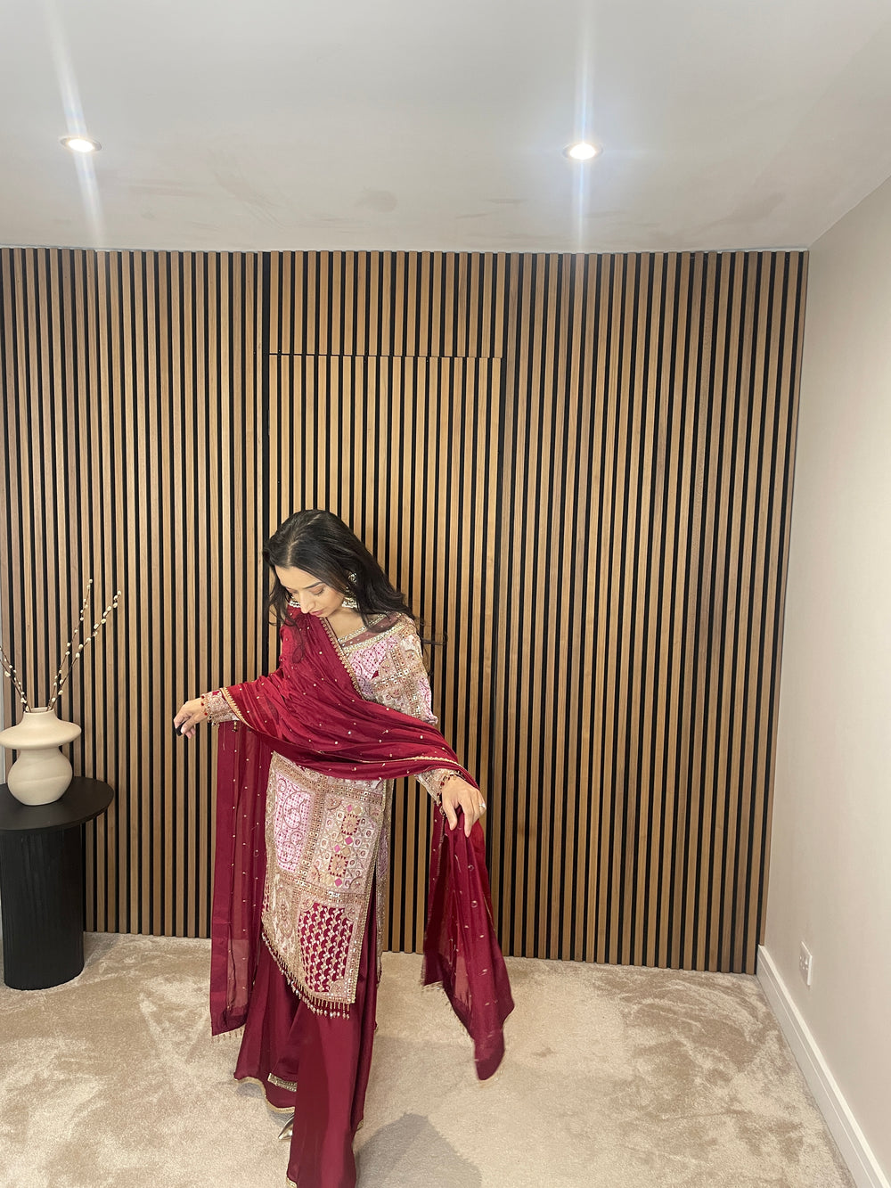 Paired with a deep red sharara to elevate the contrast and make you stand out even more — bold, confident, and unforgettable.