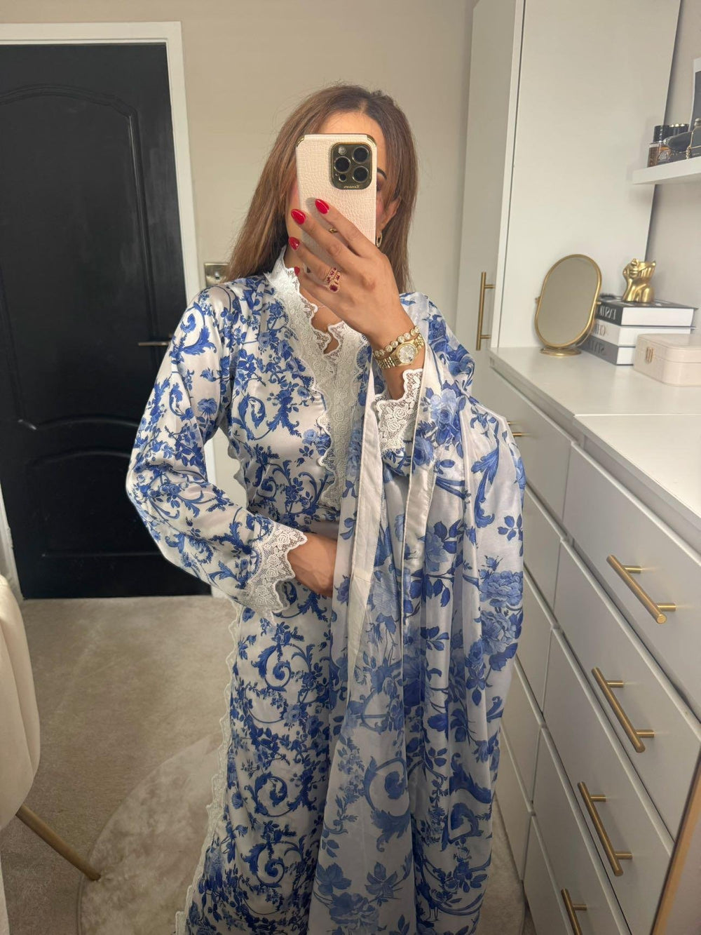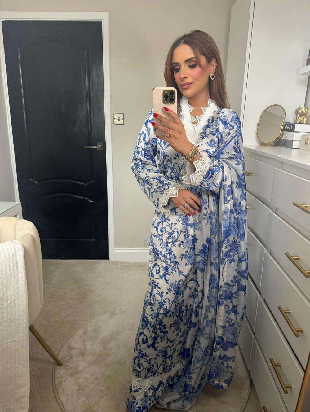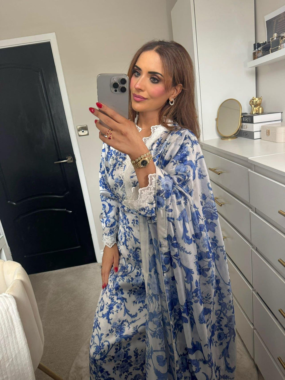Absolutely regal and elegant. The farshi trousers add a traditional yet graceful touch, and a silk scarf completes the look with a luxurious finish.