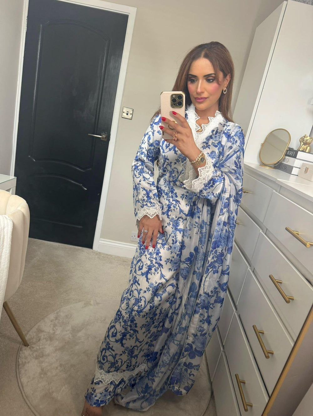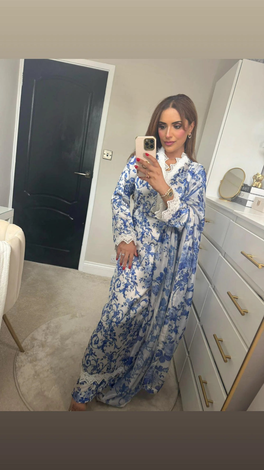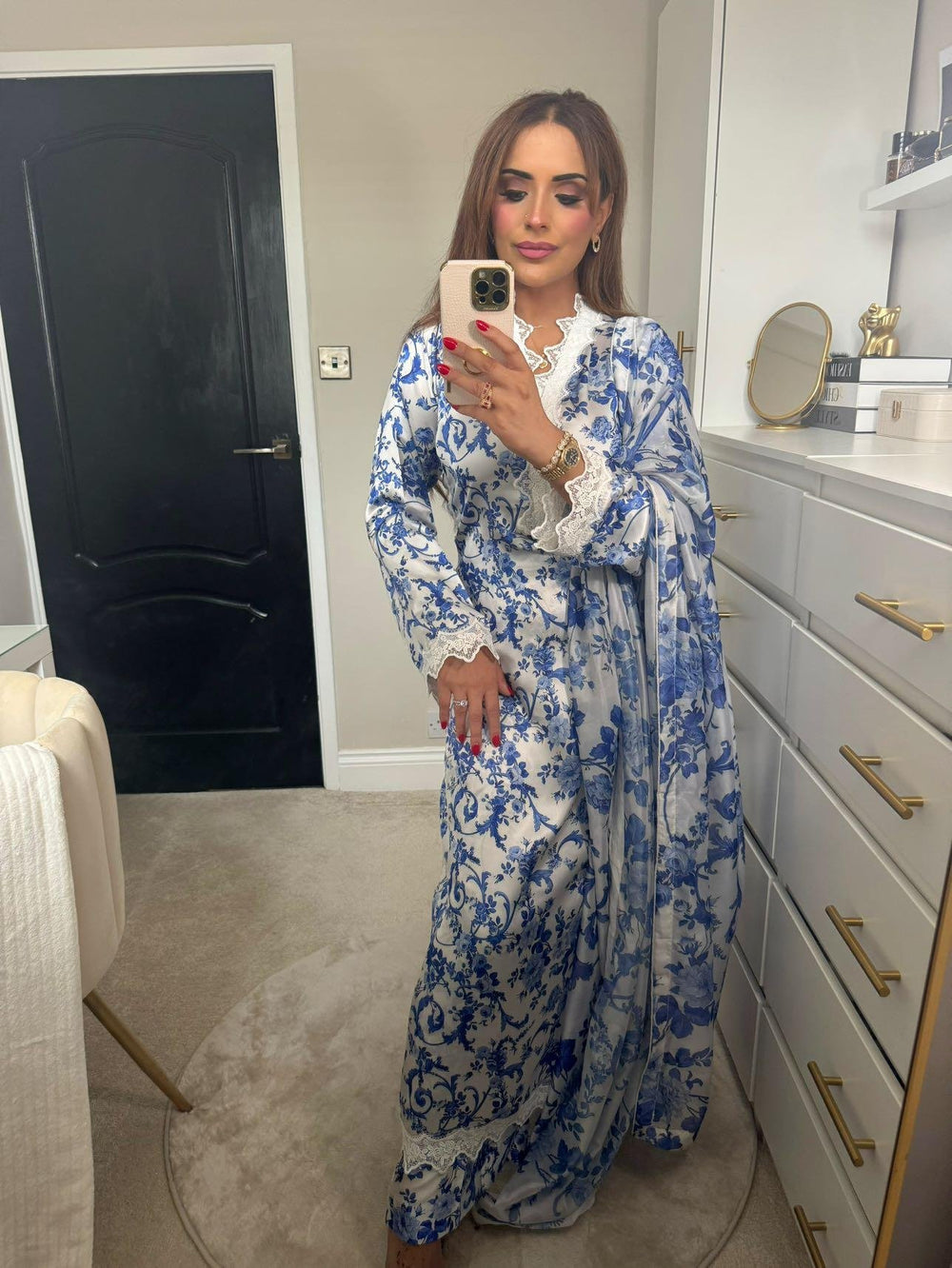 Absolutely regal and elegant. The farshi trousers add a traditional yet graceful touch, and a silk scarf completes the look with a luxurious finish.