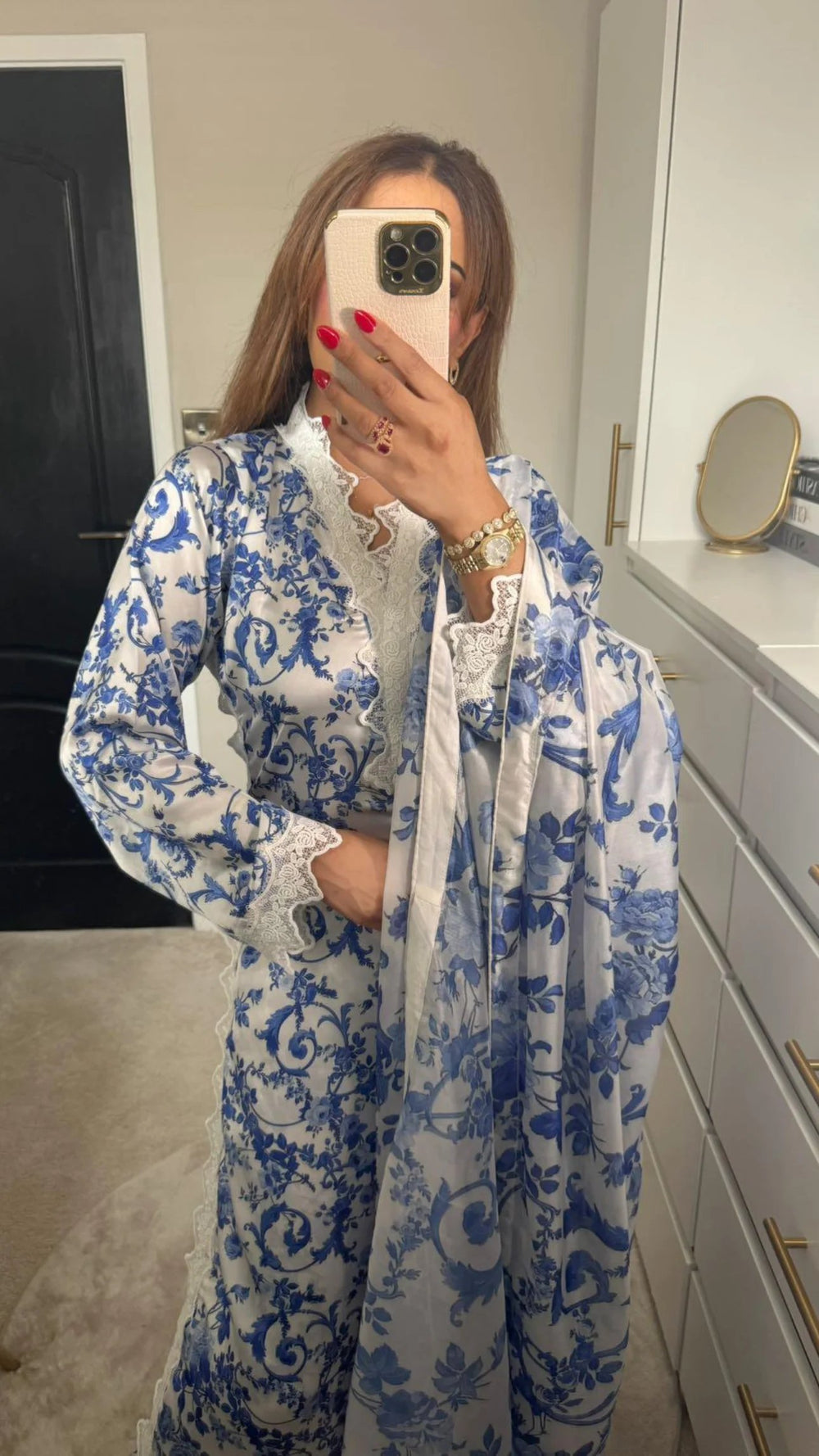 A Korean silk long kameez in lilac with intricate handwork on the neck, arms, and chalk (hem) will give a regal and sophisticated look. Pairing it with straight trousers ensures a sleek silhouette, while a chiffon scarf adds a touch of grace and flow...