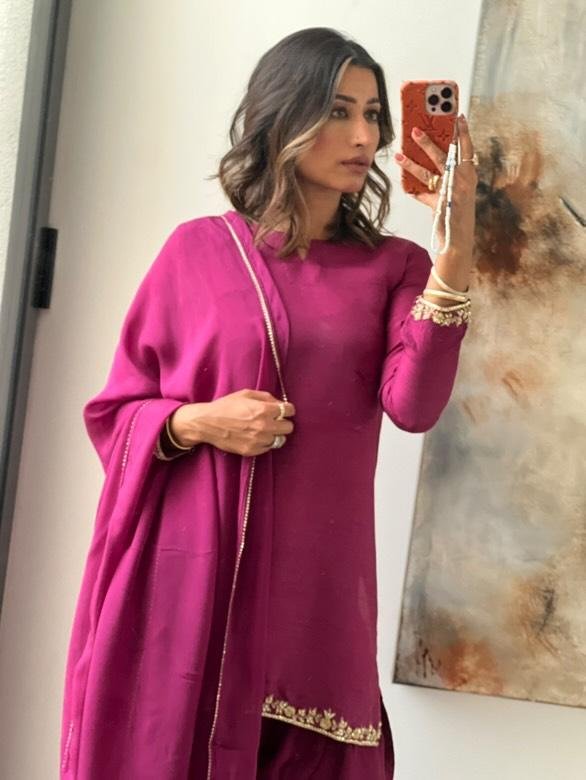 A plum farshi outfit with Korean raw silk fabric and gold embroidery on the daman.