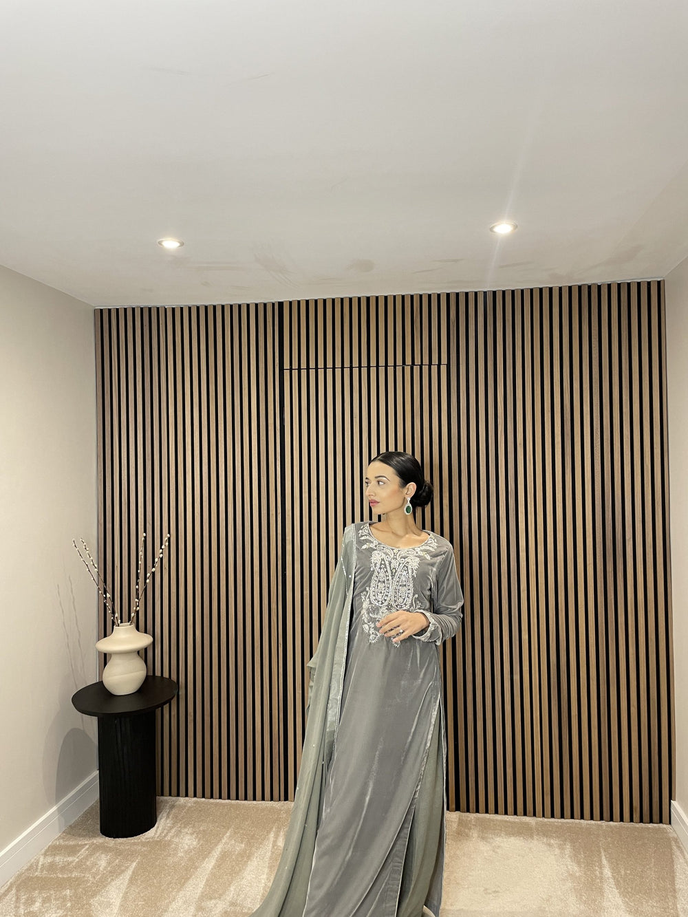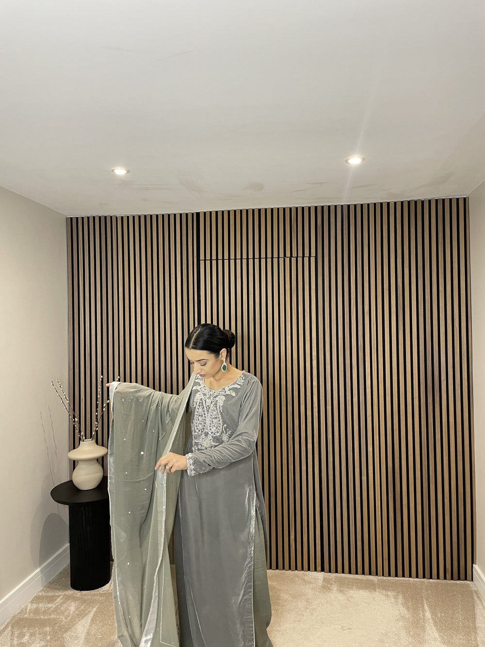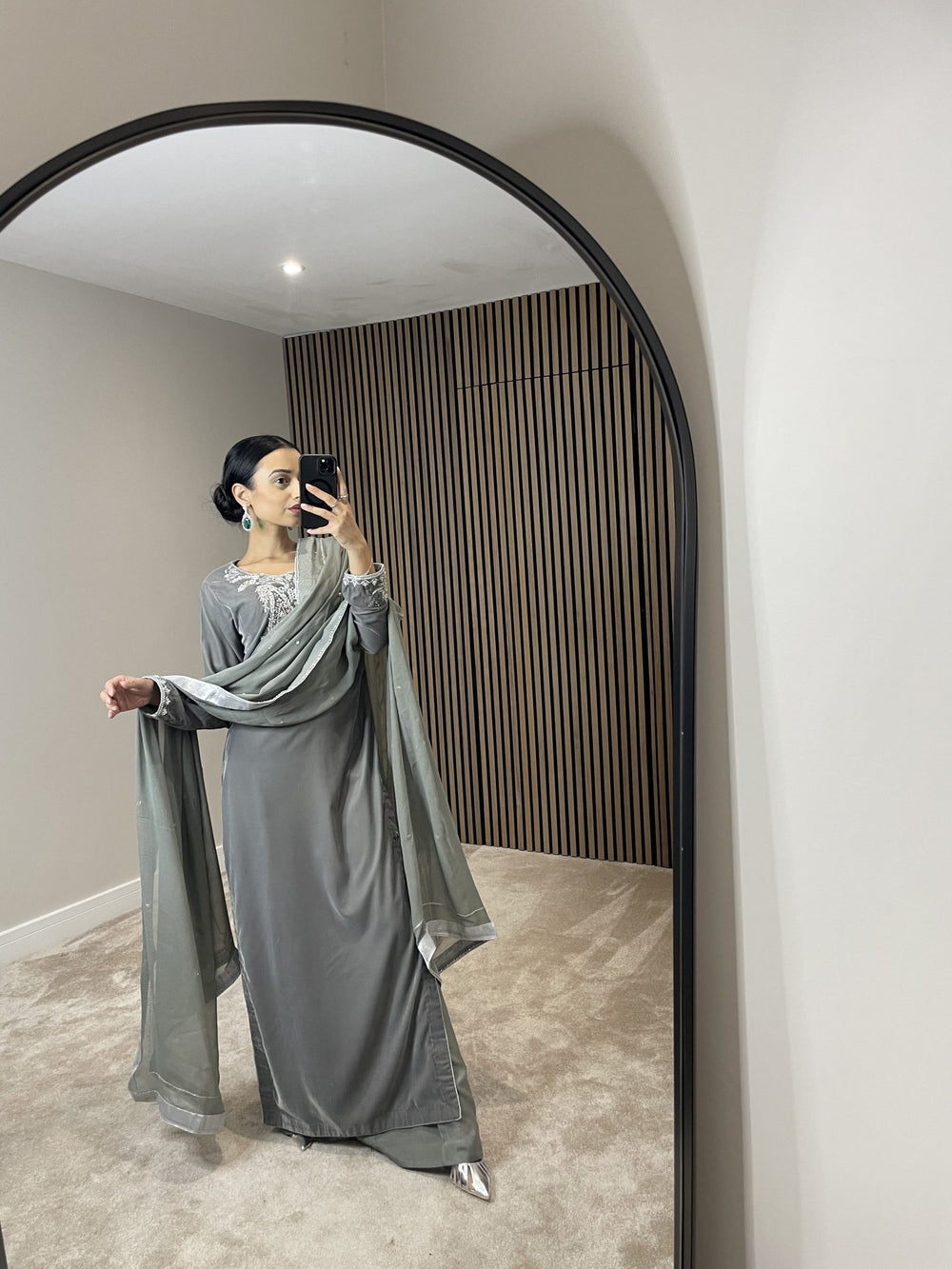 Handwork on the neck in mixed materials dabka sequins cut dana have been done on the neck and arms.