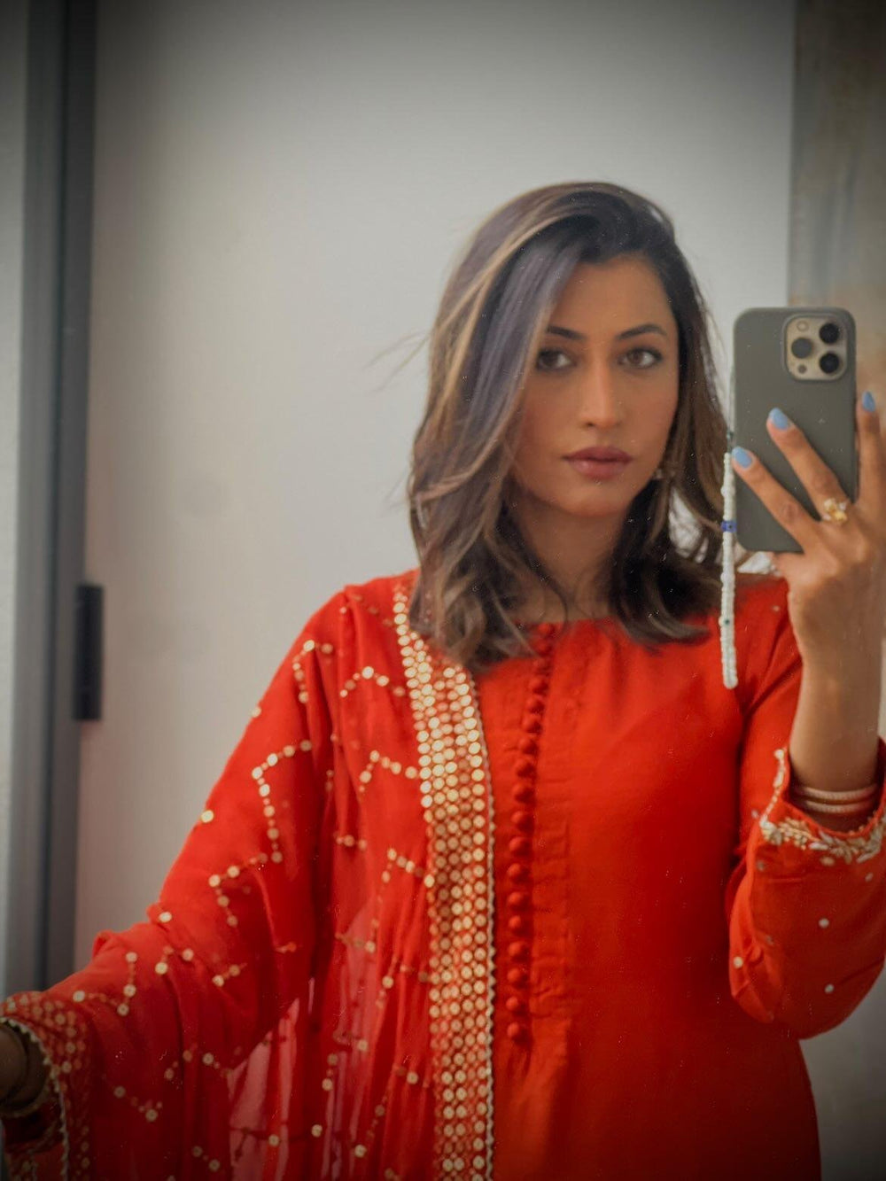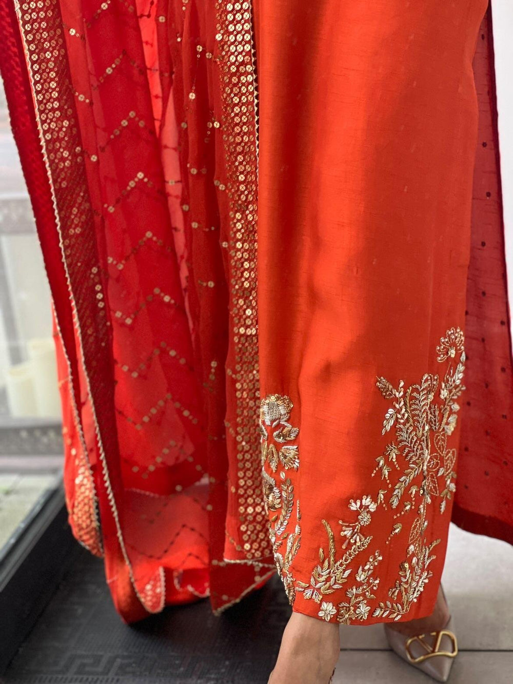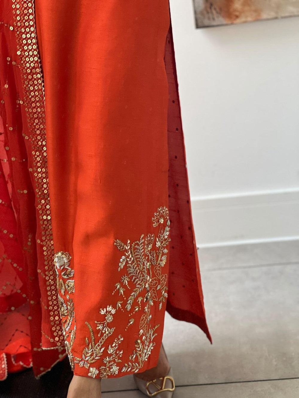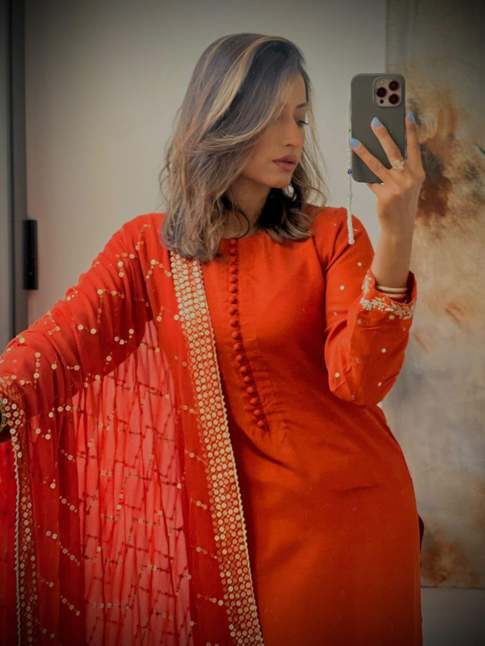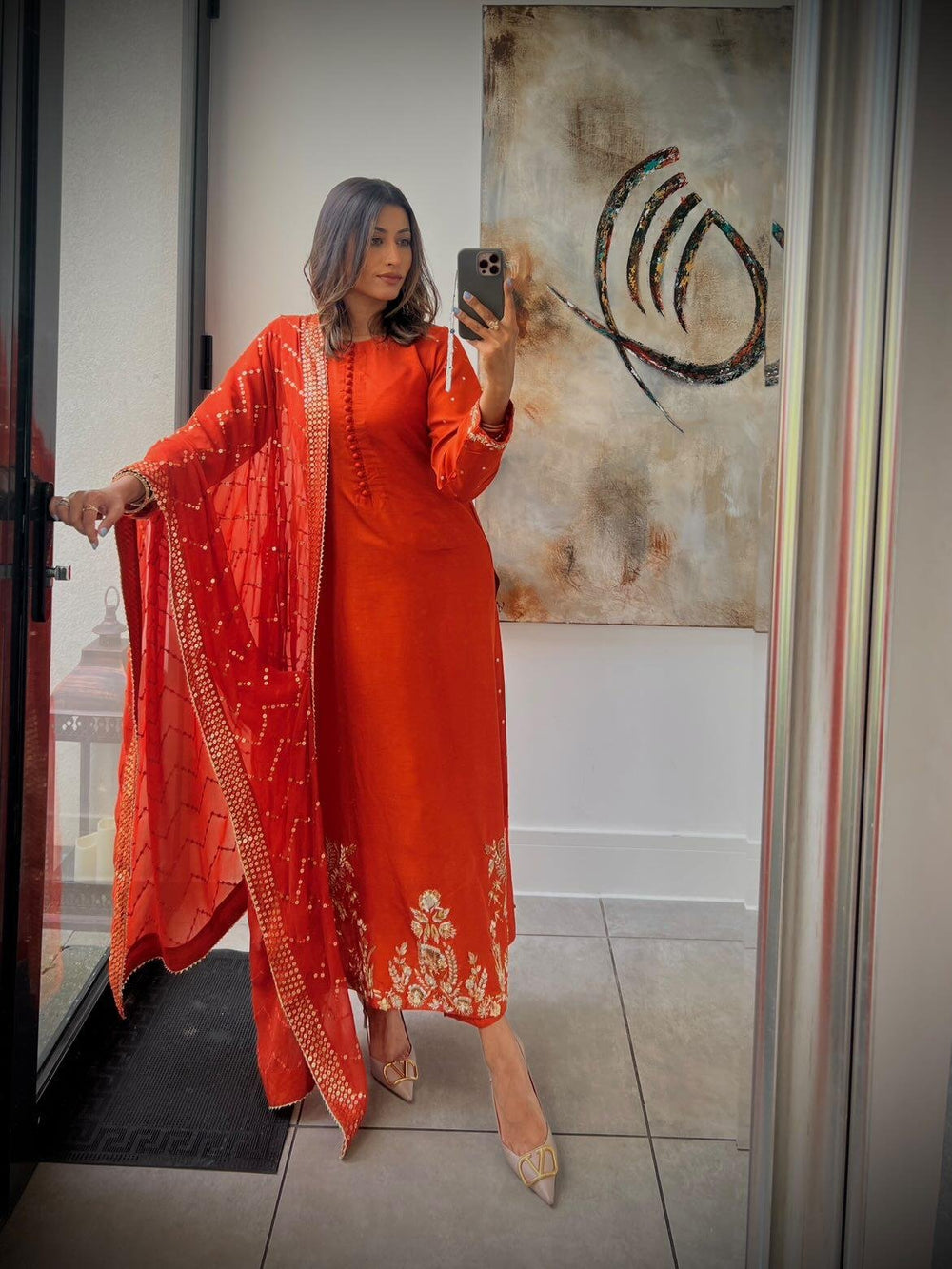 The 52-inch length suggests a graceful, flowing silhouette, complemented by straight trousers for a balanced, sleek look. The chiffon dupatta with sequins ties everything together, making it perfect for formal occasions or festive wear.