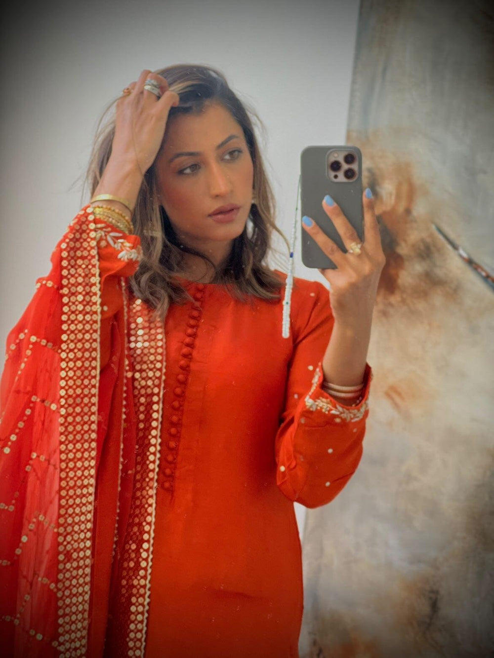 beautiful elegant outfit with intricate hand embroidery and embellishments. The combination of tilla, ari work, pearls, and sequins on the daman (hem) of the kameez adds a luxurious touch, while the sequin chan (scattered sequins) on the back and sleeves enhances the overall glamour.